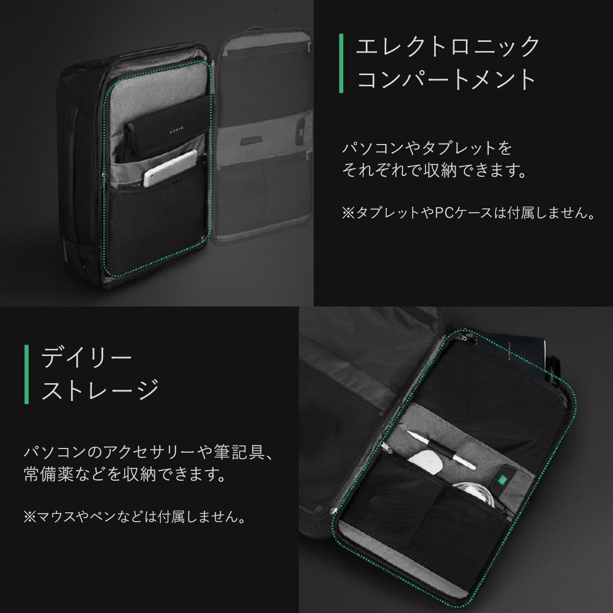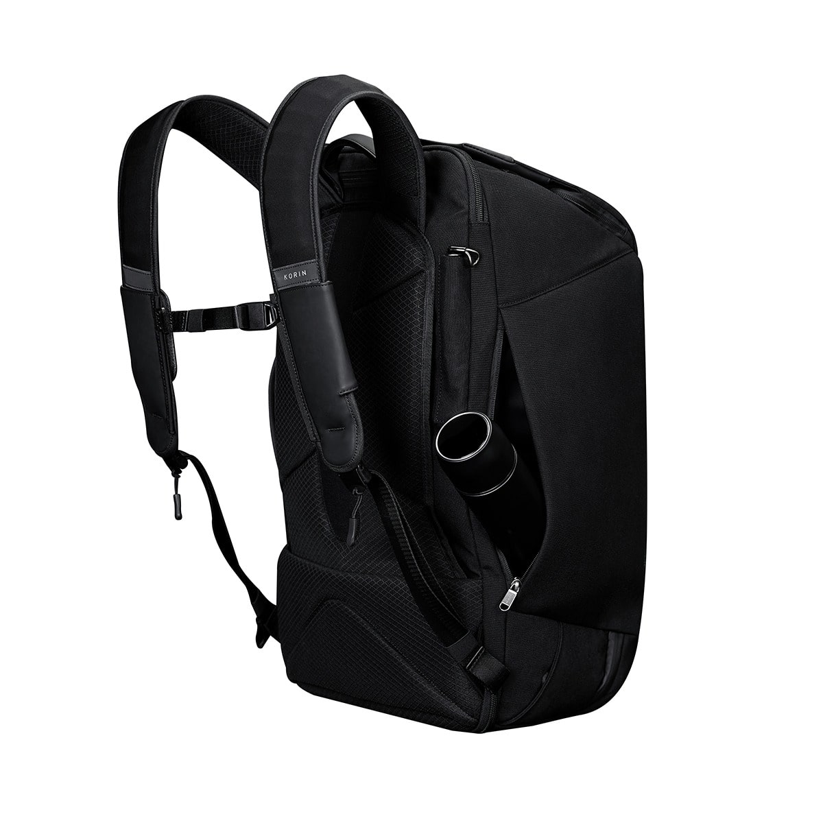 KORIN DESIGN Travlo は、大型リュックによくある問題点を解決し、より荷物を入れやすい設計にアップグレードしています。バッグの中は三層構造で、パソコンや着替えなど仕事と私物を仕分けでき、プライバシー対策もできます。このデザインによって荷物が整理整頓でき、簡単に出し入れしやすくなりました。