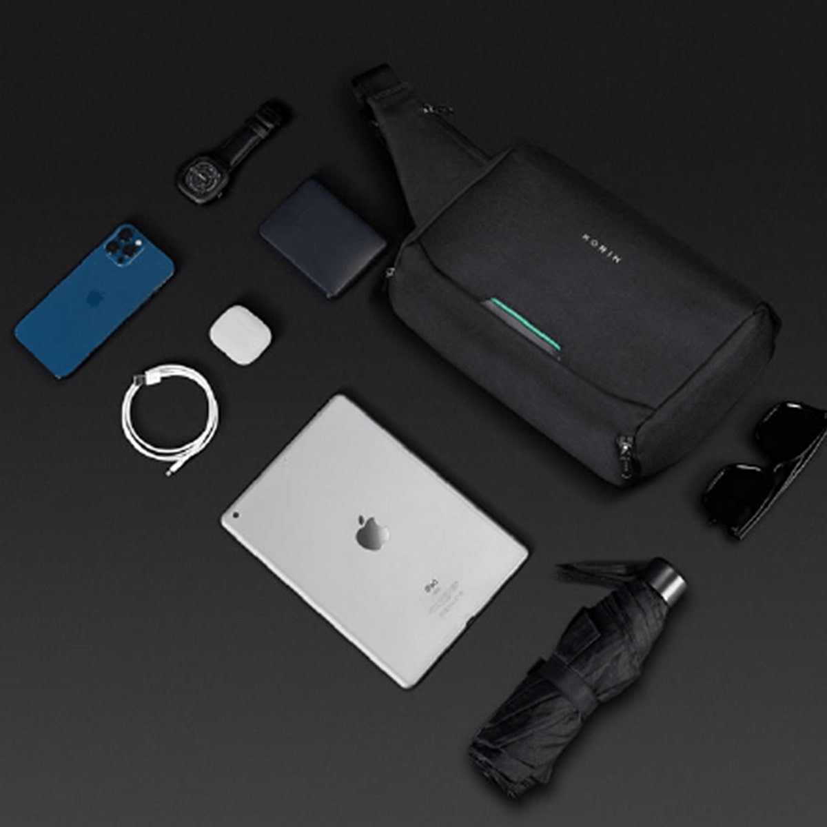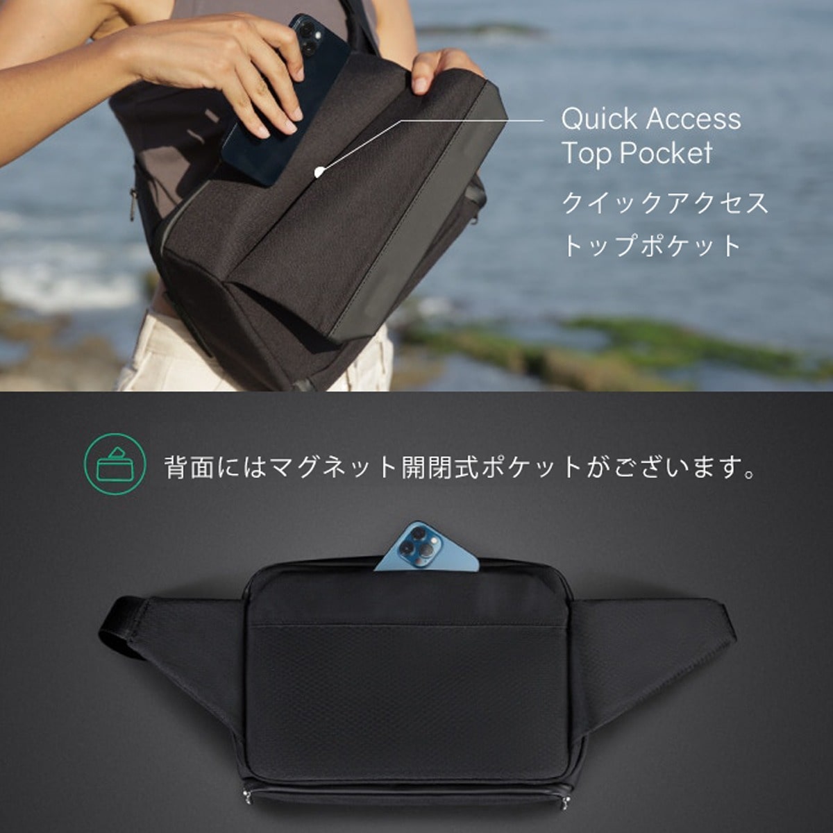 KORIN DESIGN Travlo ClickSling S は、マグネットで開閉するクイックアクセスポケットを多数備えており、スマホやイヤホンなど使用頻度の高いアイテムは楽々出し入れ可能なスリングバッグ。メイン収納はファスナー式でがばりと大きく開くので収納力は抜群。スリングバッグならではの手軽さに容量、機能性を合わせたトラベルシーン向けのボディバッグです。