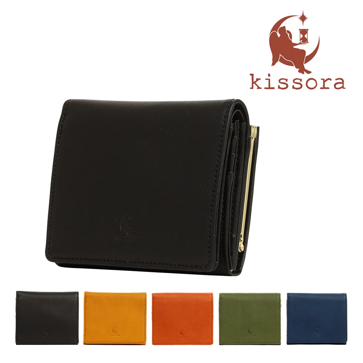 染料仕上げでナチュラルに仕上げた国産牛革に、重厚で高級感のあるオリジナルがま口を合わせたシリーズ。さりげなくkissoraのロゴを配したオリジナルのがま口がアクセントになっています。