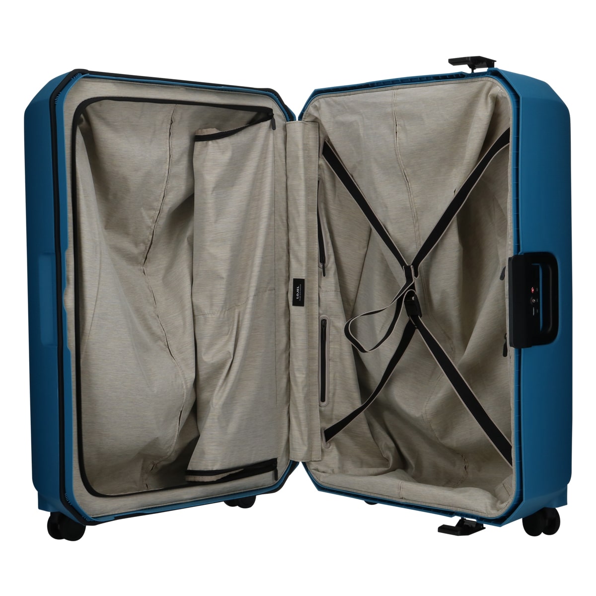 仕様:ラッチ式開閉内側:仕切り幕×1ファスナーポケット×2クロスベルト×1キャリーバー三段階調節可能TSAロック搭載