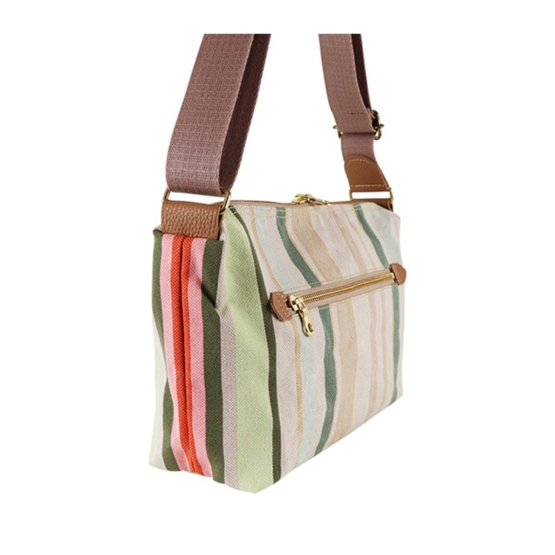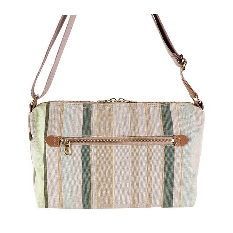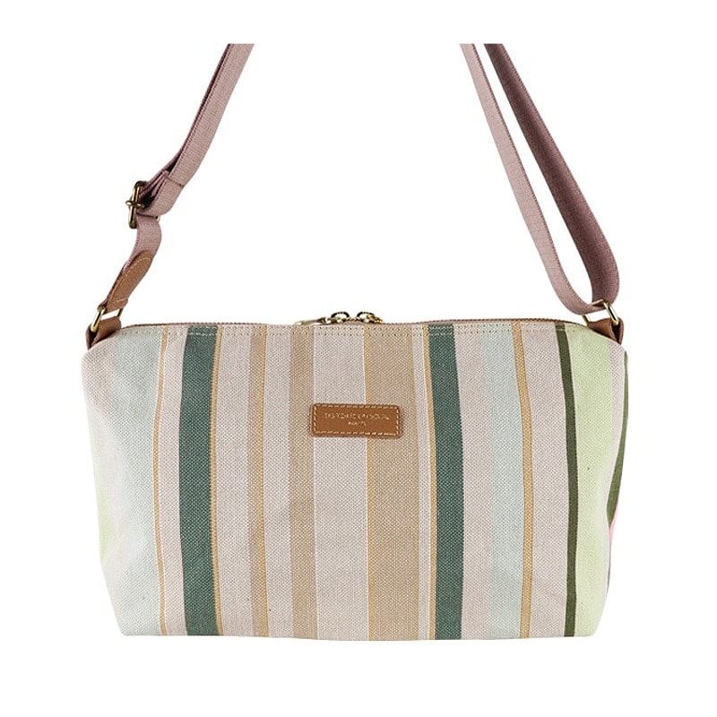 ストライプの柄ごとに色を変えたレザーをあわせ、ロゴ文字をゴールドで刻印。カジュアルになり過ぎず、コーディネートの幅も広がります。