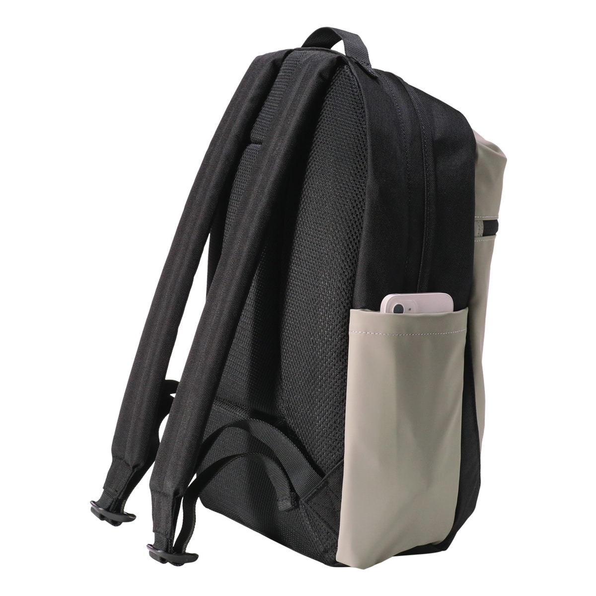 防水素材「DULON」を採用した新しいバックパックが登場。600Dポリエステルに高純度のウレタン樹脂を加工したこの素材は、軽量で防水性に優れ、キズが付きにくいため普段使いに最適です。耐久性を考慮して、底部には1000D CORDURA(R) Classic Fabricが使用されています。バックパックはA4サイズに対応し、15.6インチのPCを収納できるクッション性のあるスリーブを備えています。立体感のあるシルエットがアーバンな印象を与え、フロントには大きなジッパーポケット、両サイドにはオープンポケットがあります。ショルダーストラップは肌に優しいナイロンウェービングテープを採用し、背面は通気性に優れたメッシュ地です。通学用としても便利なデザインで、ライトグレーのカラーが特徴です。