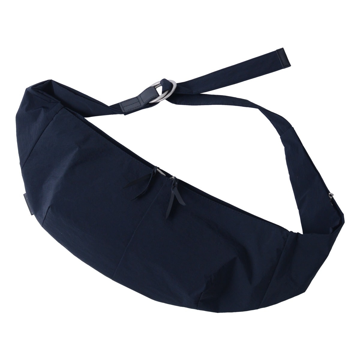 本体生地には、製造工程において発生した廃棄物を再利用したプレコンシューマ・リサイクルナイロン糸を平織りした生地に小松マテーレ(株)のKONBU(R)-Nという特殊加工を施した素材を使用。自立するほどの硬度と引き裂きへの強度がありながら手に持ってみると驚くほどの軽さがあることが特徴です。付属レザーには1898年創業のイタリア ミラノに所在する老舗タンナー「MONFRTNI PELLAMI S.R.L.(モンフリーニペラーミ)社」のクロムレザーを使用。プレーンなスムースレザーながら程よい光沢を醸し出した綺麗な表面が特徴です。立体的なカッティングで見た目以上に収納力があり、前後胴共通のデザインになっていることで、利き腕に関係なく使用することができます。カジュアルな質感の生地でワントーンに抑えたシンプルなデザインと、独特のハリやシワ感、マットな風合いが特徴のKONBU (R)-N加工が施された本体生地が魅力のシリーズです。