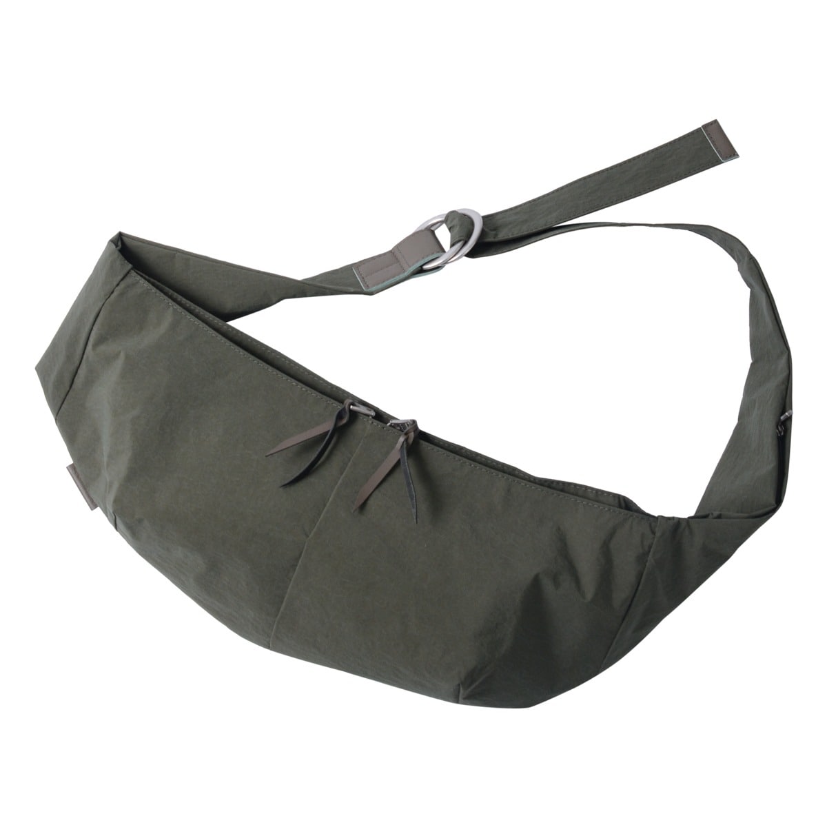本体生地には、製造工程において発生した廃棄物を再利用したプレコンシューマ・リサイクルナイロン糸を平織りした生地に小松マテーレ(株)のKONBU(R)-Nという特殊加工を施した素材を使用。自立するほどの硬度と引き裂きへの強度がありながら手に持ってみると驚くほどの軽さがあることが特徴です。付属レザーには1898年創業のイタリア ミラノに所在する老舗タンナー「MONFRTNI PELLAMI S.R.L.(モンフリーニペラーミ)社」のクロムレザーを使用。プレーンなスムースレザーながら程よい光沢を醸し出した綺麗な表面が特徴です。立体的なカッティングで見た目以上に収納力があり、前後胴共通のデザインになっていることで、利き腕に関係なく使用することができます。カジュアルな質感の生地でワントーンに抑えたシンプルなデザインと、独特のハリやシワ感、マットな風合いが特徴のKONBU (R)-N加工が施された本体生地が魅力のシリーズです。