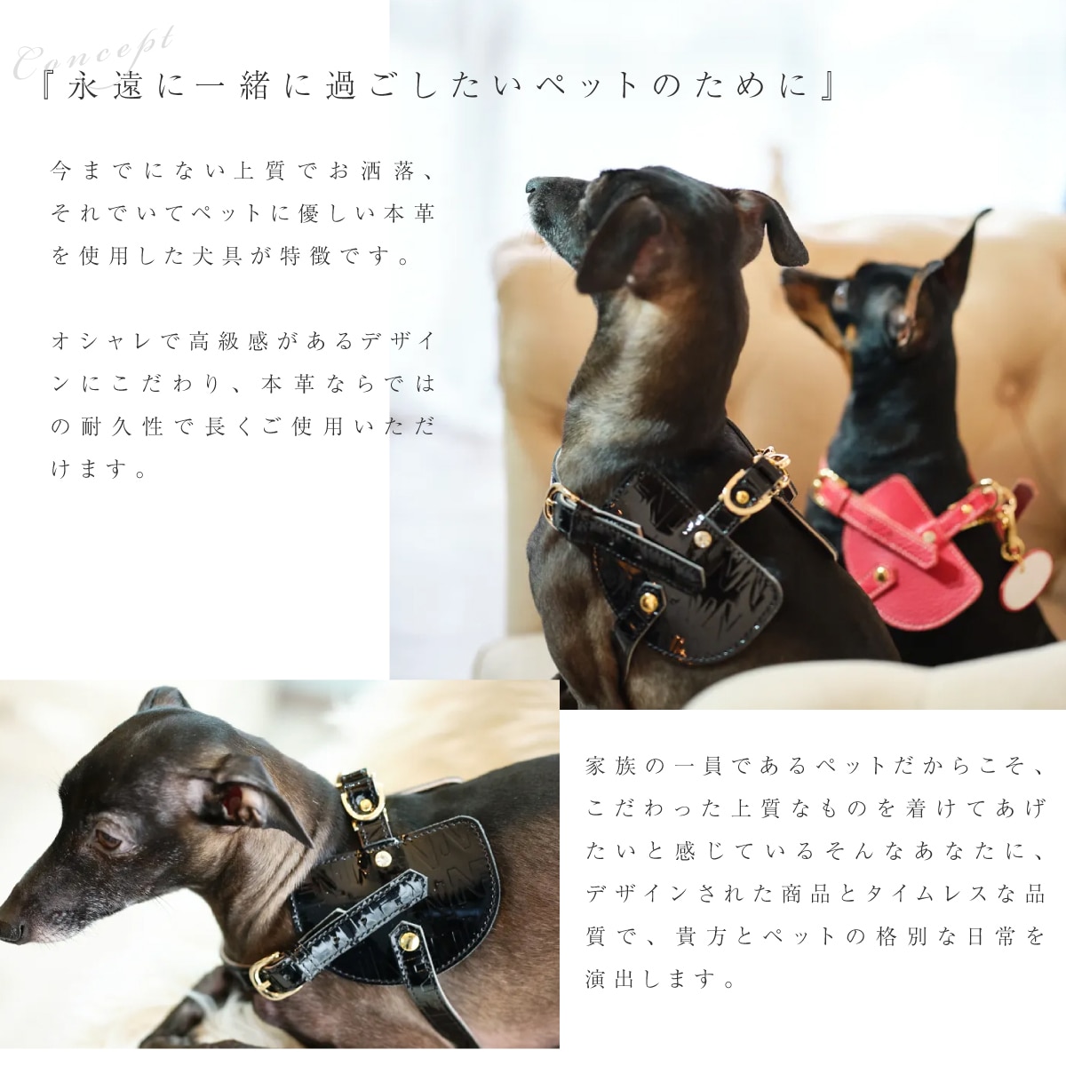 「永遠に一緒に過ごしたいペットのために」、家族の一員であるペットだからこそ、こだわった上質なものを着けてあげたいと感じているそんなあなたに、デザインされた商品とタイムレスな品質で、貴方とペットの格別な日常を演出します。