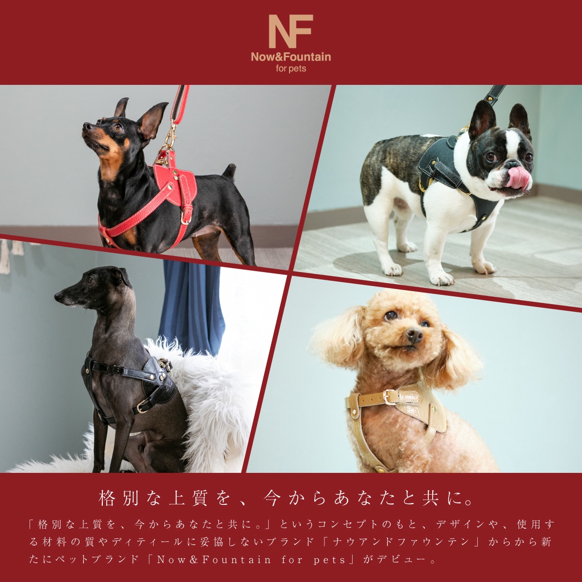 「格別な上質を、今からあなたと共に。」というコンセプトのもと、デザインや、使用する材料の質やディティールに妥協しないブランド「ナウアンドファウンテン」からから新たに誕生したペットブランド「Now&Fountain for pets」。 「永遠に一緒に過ごしたいペットのために」、家族の一員であるペットだからこそ、こだわった上質なものを着けてあげたいと感じているそんなあなたに、デザインされた商品とタイムレスな品質で、貴方とペットの格別な日常を演出します。 今までにない上質でお洒落、それでいてペットに優しい本革を使用した犬具が特徴です。オシャレで高級感があるデザインにこだわり、本革ならではの耐久性で長くご使用いただけます。