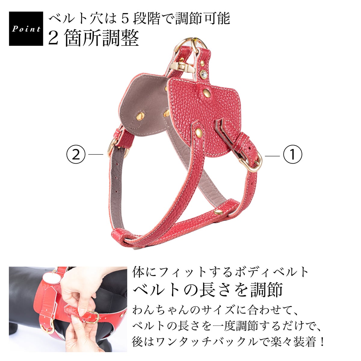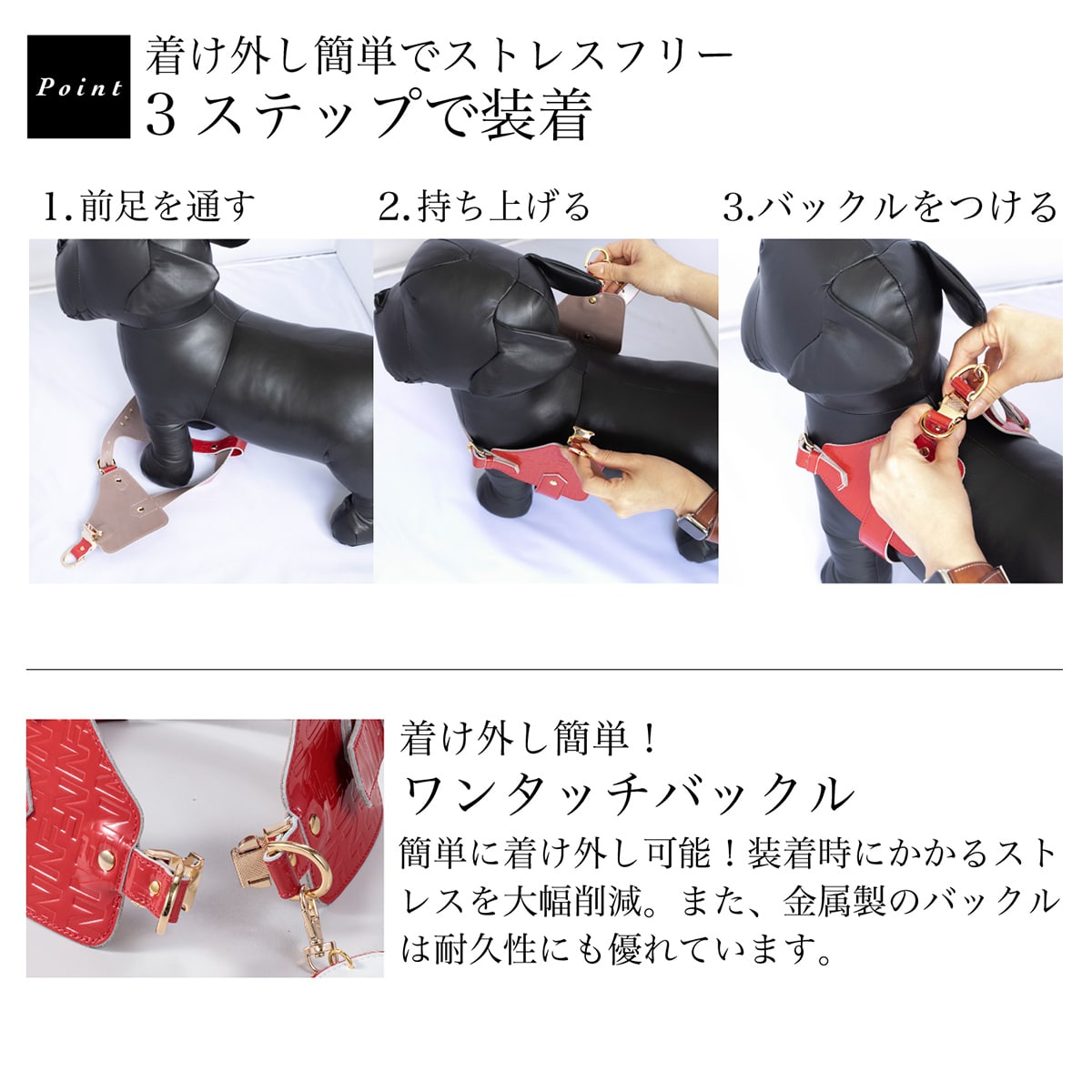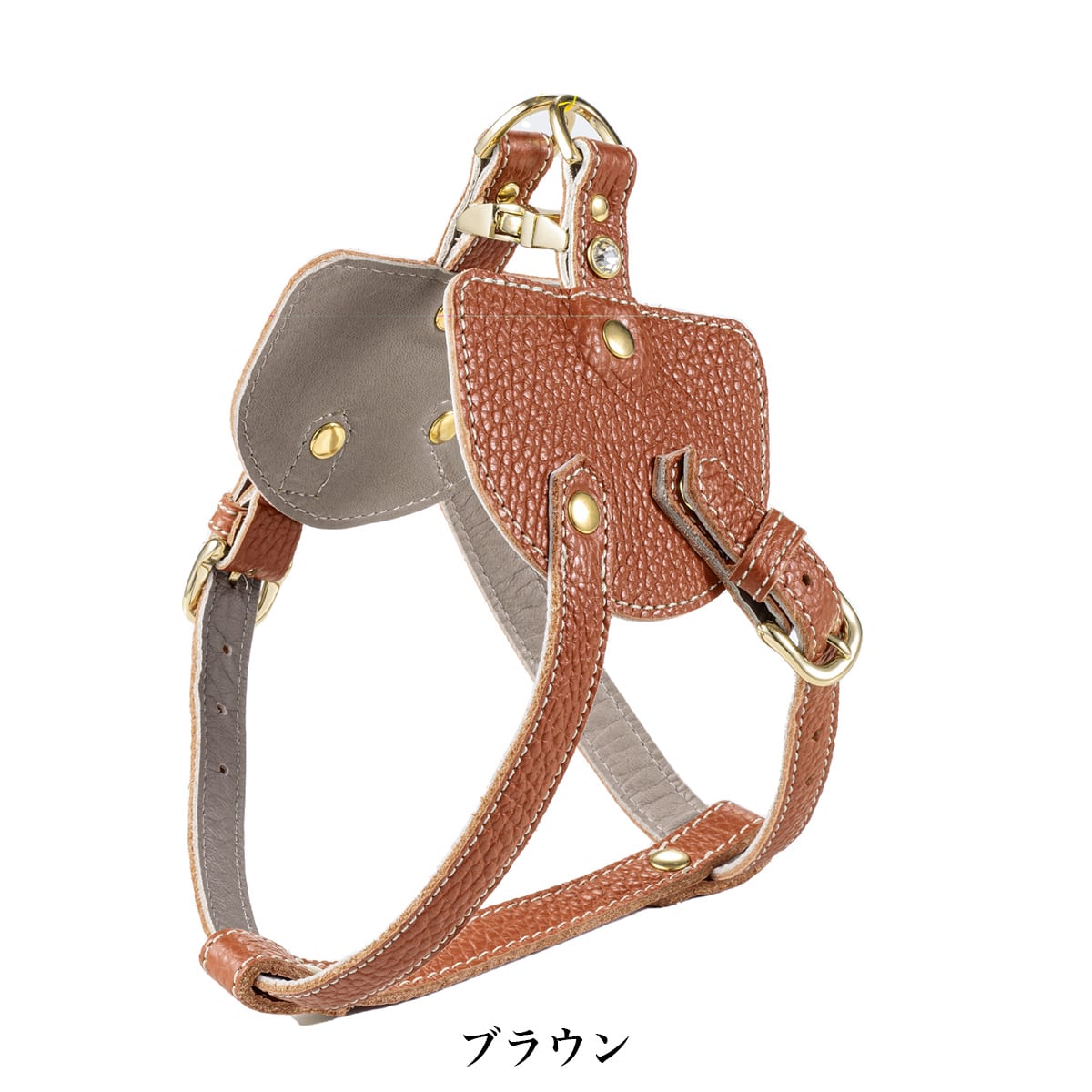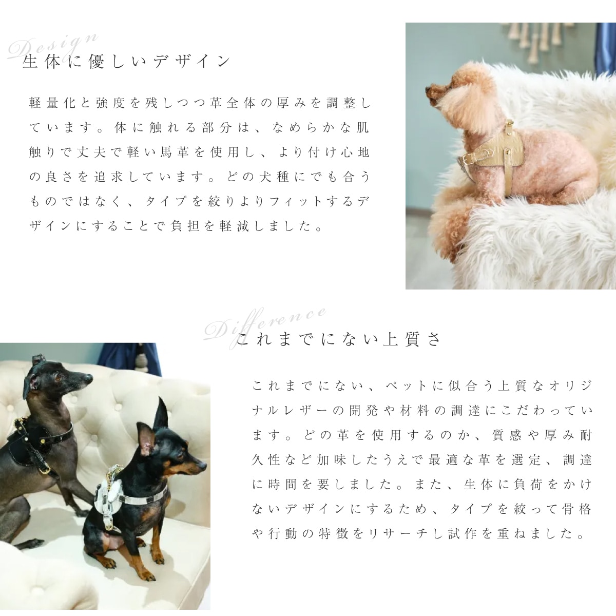 今までにない上質でお洒落、それでいてペットに優しい本革を使用した犬具が特徴です。オシャレで高級感があるデザインにこだわり、本革ならではの耐久性で長くご使用いただけます。