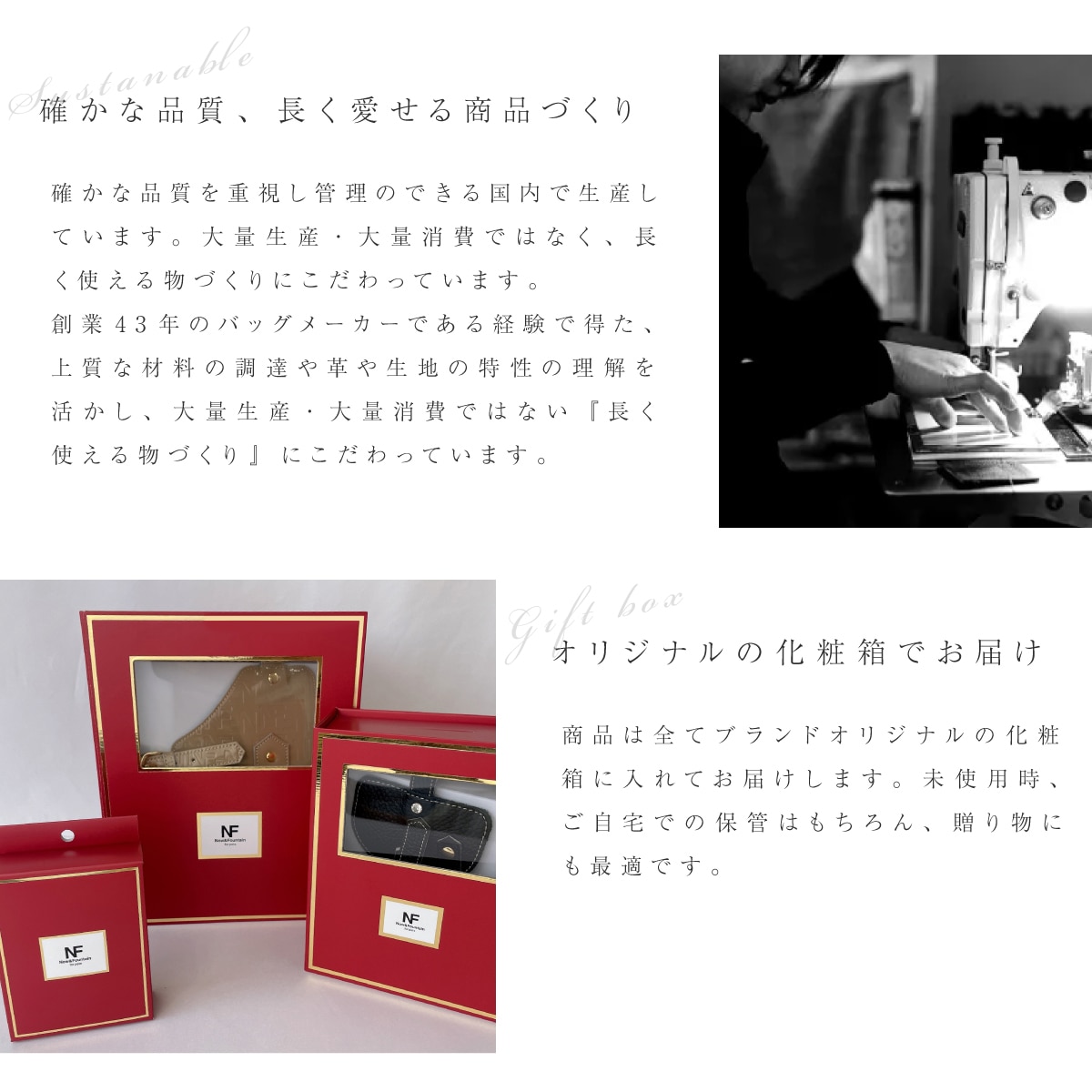 確かな品質を重視し管理のできる国内で生産しています。大量生産・大量消費ではなく、長く使える物づくりにこだわっています。創業43年のバッグメーカーである経験から上質な材料を調達するルートがあり、革や生地の特性を理解し長く愛されるものづくりに活かしています。