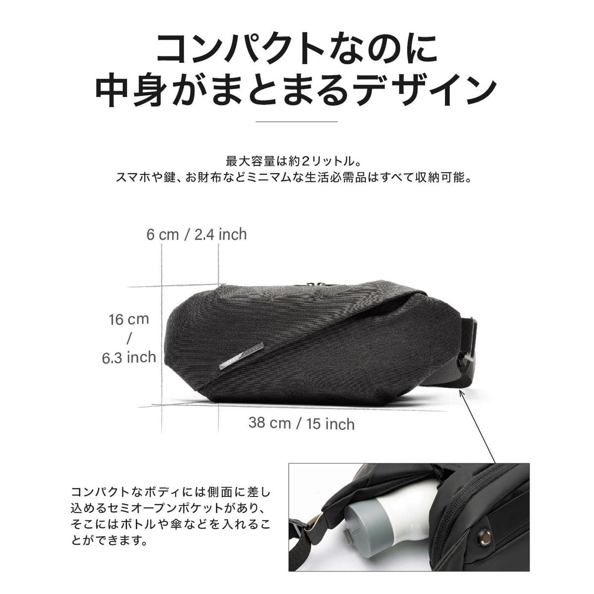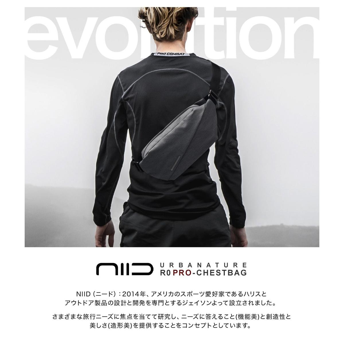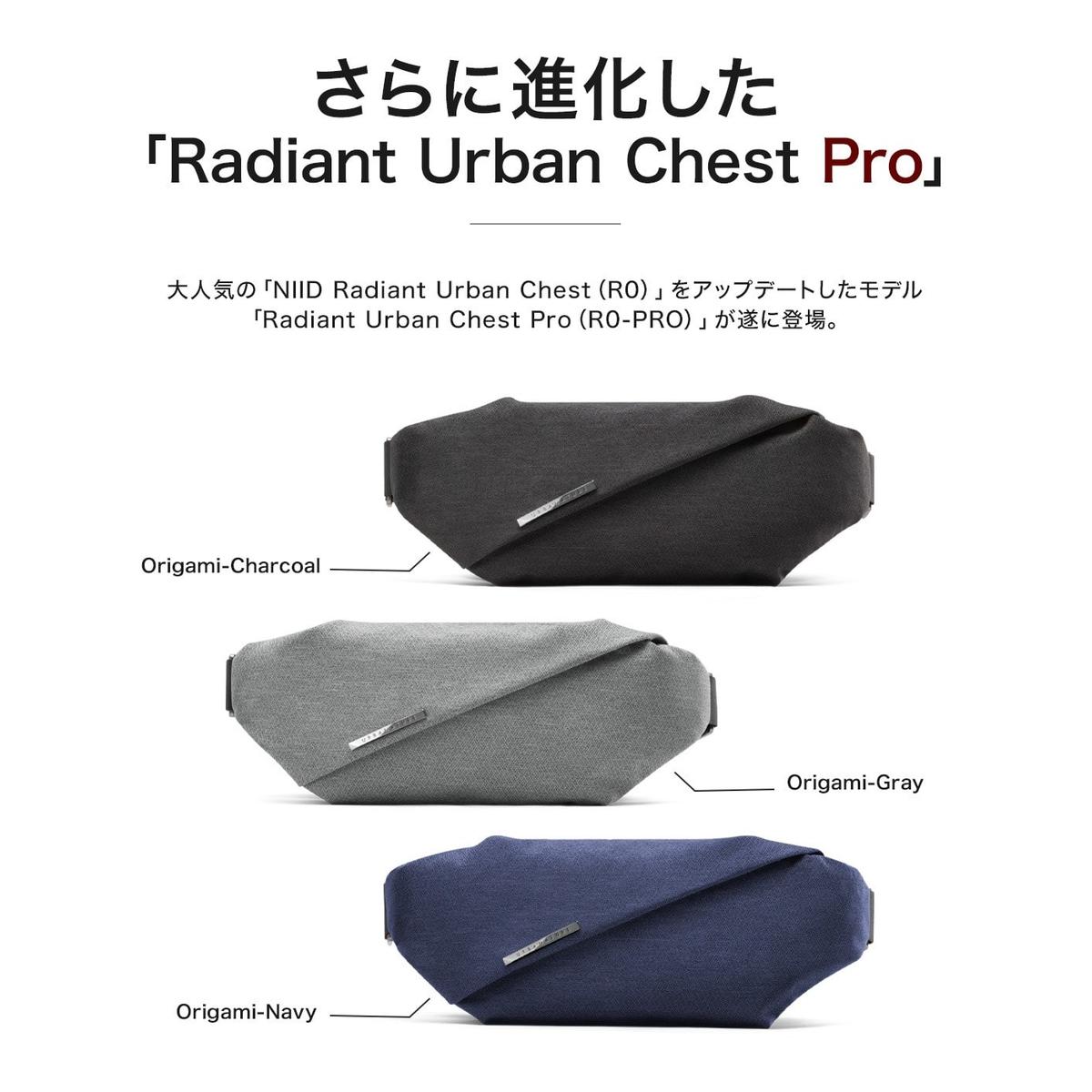 「NIID Radiant Urban Chest(R0)」をアップデートしたモデル「Radiant Urban Chest Pro(R0-PRO)」【機能的なストレージスペース】コンパクトなボディなのに複数の仕切りで、収納力抜群!【コンパクトでも収納力抜群】取り出しが簡単なセミオープンコンパートメントでペットボトルや傘を楽々収納!内側にも多数のポケットが付いているので、必需品をまとめて運ぶことができます。【安心の撥水加工】水をはじくように設計されているので、急な雨でも安心。大切な持ち物をしっかりと守ります。【PROモデルはここが違う】1.通常モデルはマグネットバックルの開閉時に少しコツがいるというご意見も頂いており、マグネットバックル Ver.へアップグレードし、よりスムーズな開閉を追求した。2.両サイドのセミオープンポケットのパーツを見直し、リッチな質感の金属パーツに変更。より使いやすく中に入れるものを選ばない仕様になった。3.グローバルなデザインに和のテイストを意識した「オリガミ・ファブリック」を使用し、奥ゆかしい雰囲気の漂うモデルとなった。