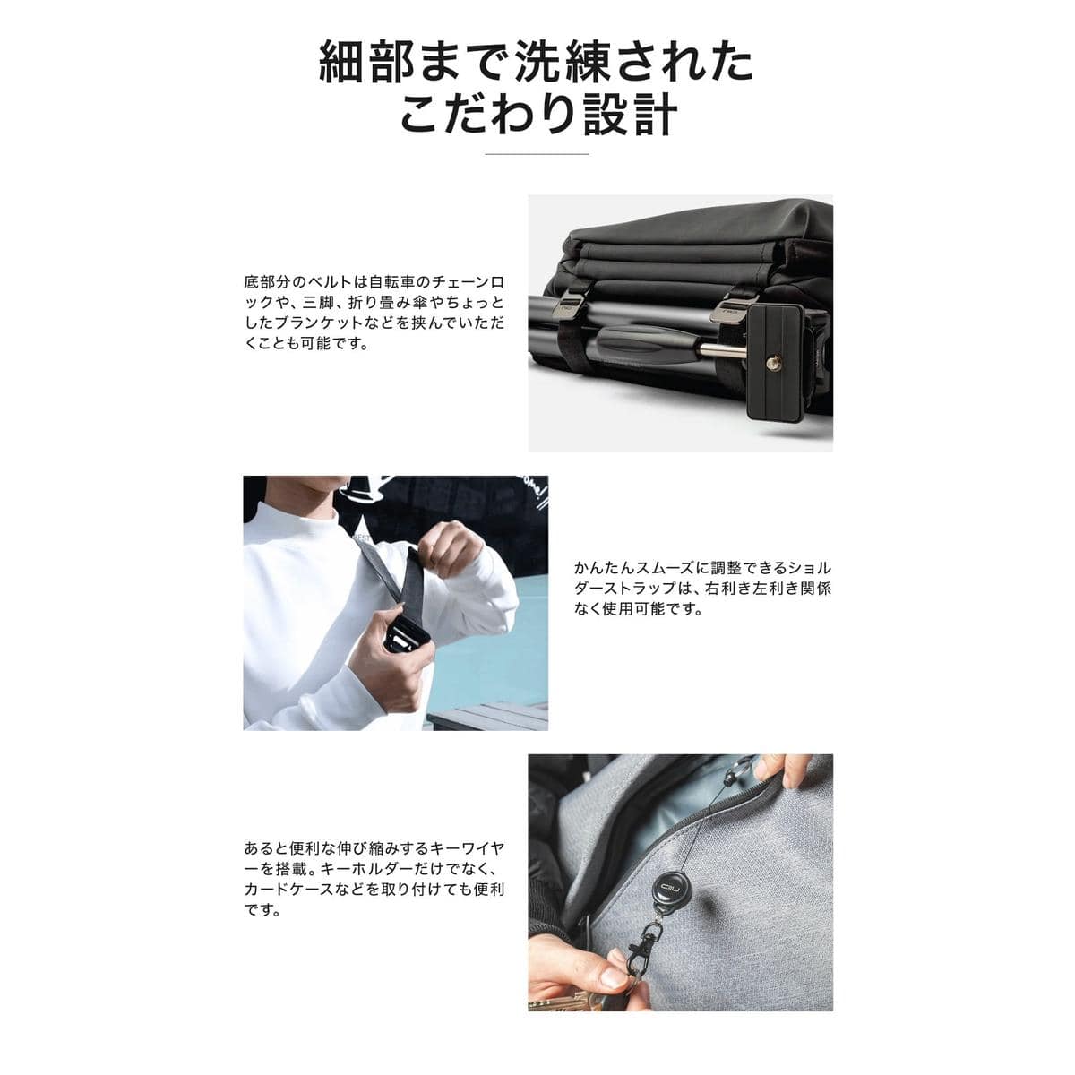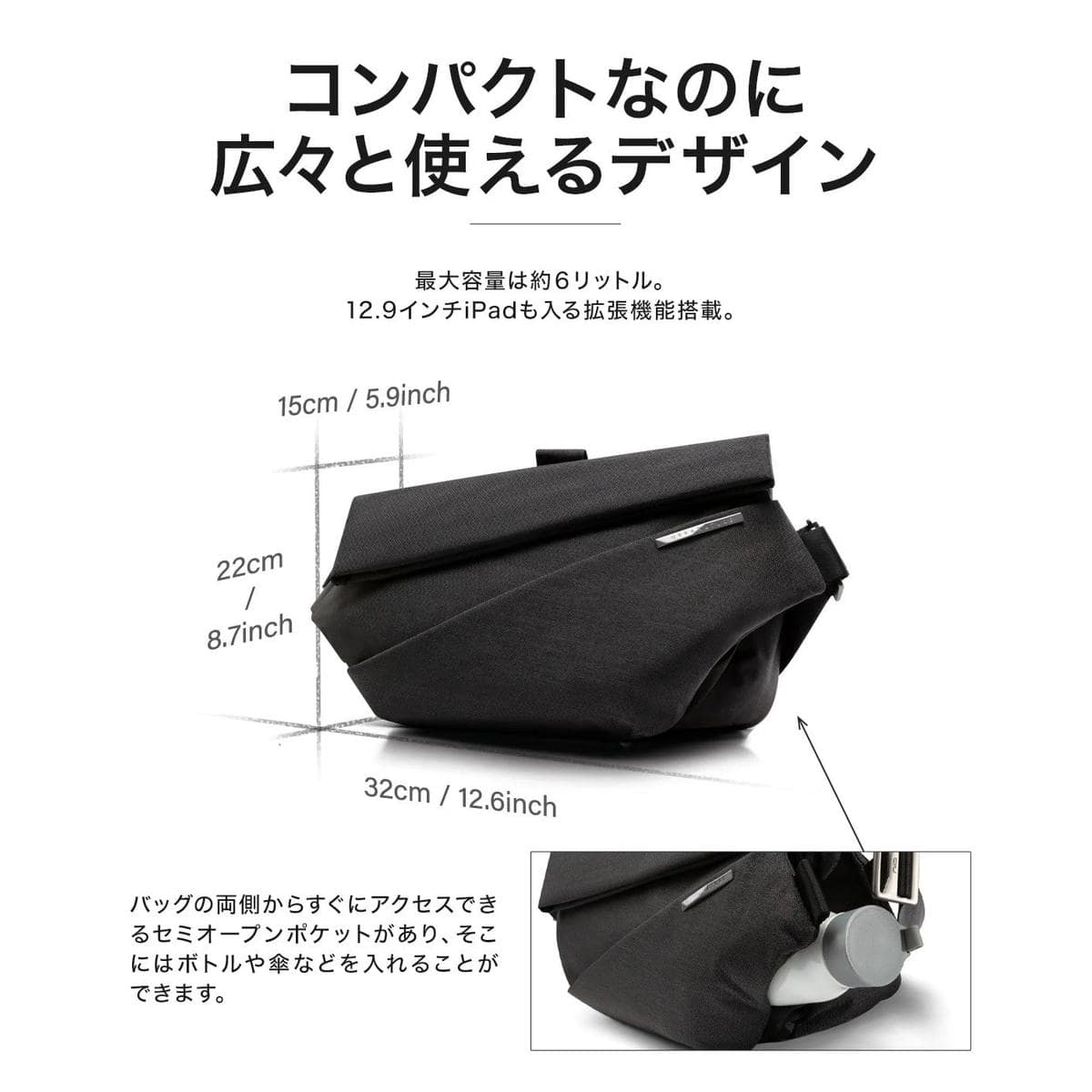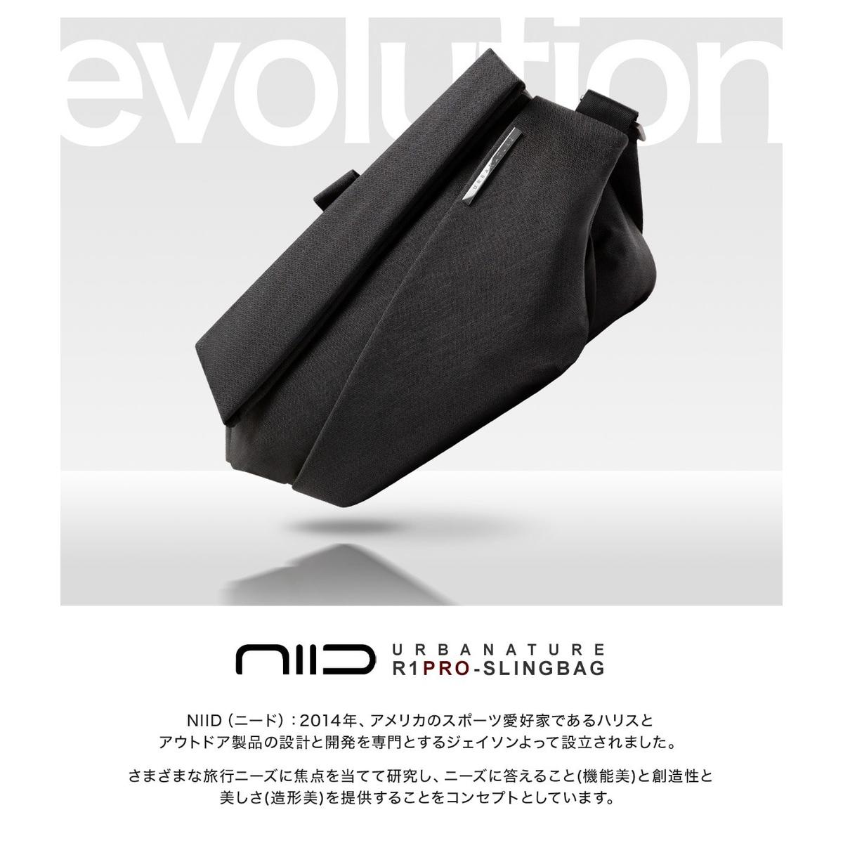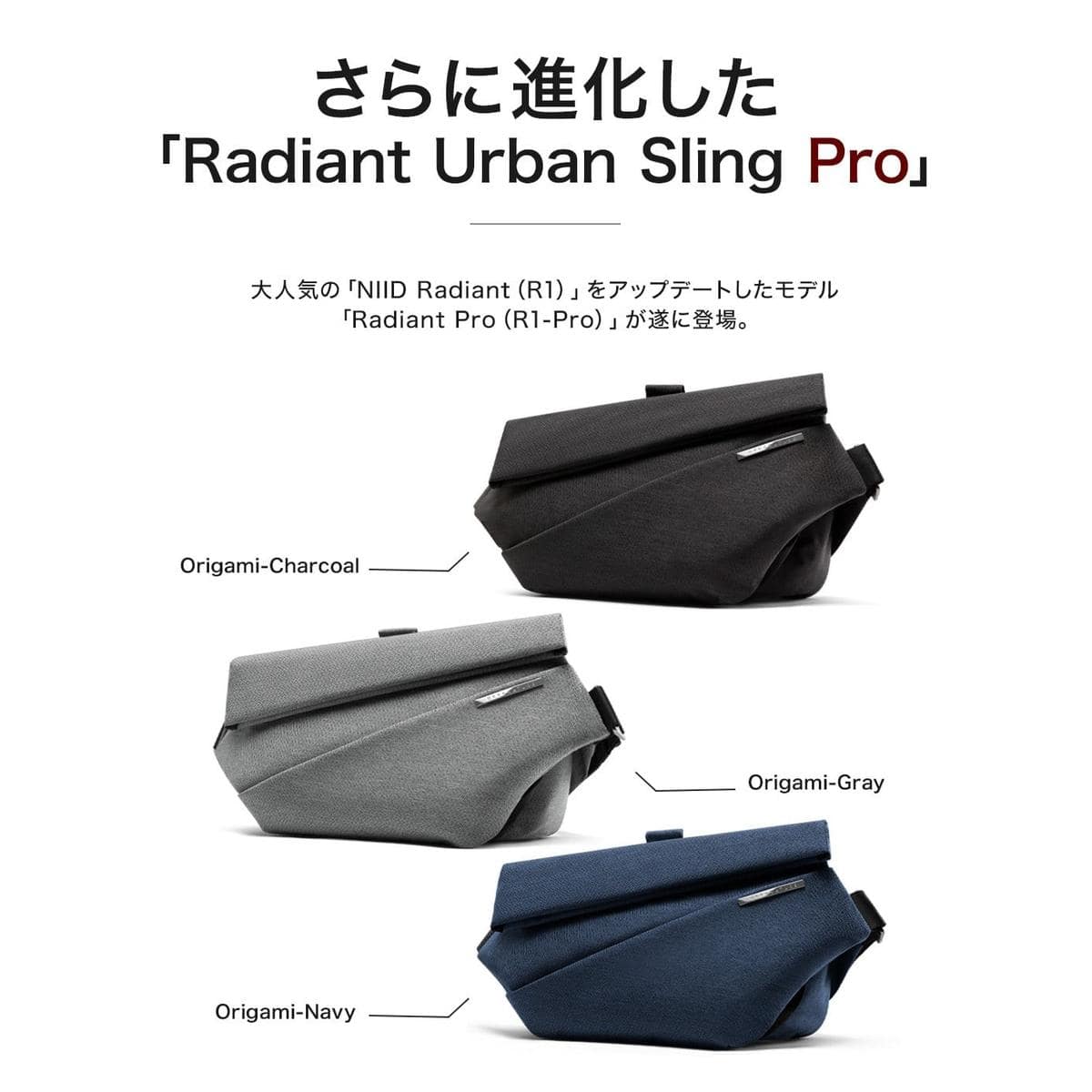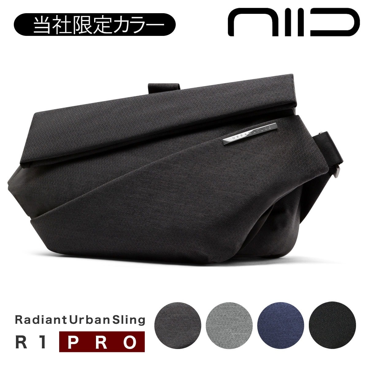 「NIID Radiant(R1)」をアップデートしたモデル「Radiant Pro(R1-Pro)」【12.9インチiPadも入る拡張機能】iPadやノート、傘やお財布など生活必需品はすべて収納できます。 仕事も学校もプライベートも、サブバッグ不要で毎日が身軽に!【傘やペットボトルを入れて!オープンポケット】大型バッグによくあるサイドポケットを採用しました。 防水のため、濡れた物もこのポケットに入れれば他の中身が濡れる心配もありません! サッと取り出せるので、よく使う物を入れる場所としてもおすすめです。【手間いらず!マグネット式簡単ロック】マグネット式のクイックロックシステムを使用しているので、近づけるだけで瞬時にロックししっかりホールド。 紐の部分を水平方向に持ち上げない限りロックが取れることはありません。 一般的なバックルは、ロックする時と外すときに多少の力や手間がかかりますが、Radiant Urban Slingはマグネット式のため力も手間も不要です。【肩への負担を抑えるショルダーストラップ】ストラップの長さ調節が一瞬!その場に応じて最適な長さに調節することができます。 ウォーキング、ランニング、サイクリングなどシーンに合わせて瞬時に長さを調節。 さらに左右どちらの肩にかけても違和感のない設計になっています。 長さ調節と荷物をかける肩の入れ替えで、肩への普段を最大限抑えます。【マグネットロックの中央ポケット】荷物が取り出しやすく開け閉めが簡単なマグネットロックを採用。 ガバッとほぼ円形の形まで開くことができる為、中の荷物を確認しやすく、 手を放すだけでマグネットがくっつきほぼ自動でバッグが閉まります。【PROモデルはここが違う】1.通常モデルはマグネットバックルの開閉時に少しコツがいるというご意見も頂いており、マグネットバックル Ver.へアップグレードし、よりスムーズな開閉を追求した。2.両サイドのセミオープンポケットのパーツを見直し、リッチな質感の金属パーツに変更。より使いやすく中に入れるものを選ばない仕様になった。3.グローバルなデザインに和のテイストを意識した「オリガミ・ファブリック」を使用し、奥ゆかしい雰囲気の漂うモデルとなった。