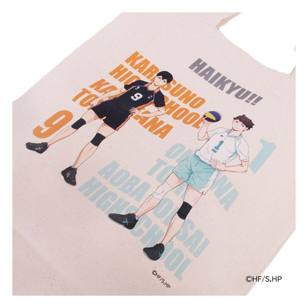 「烏野高校」「音駒高校」「青葉城西高校」「稲荷崎高校」のキャラクターをモチーフにしたデザイン。各高校の横断幕を英語表記にしたプリントがポイントのキャンバストート。キャラクターの背面にはさりげなくそれぞれの背番号もプリントされています。内側にオープンポケットが備わっていて、A4サイズがすっぽり収納可能。持ち手部分も肩掛けのしやすい長さとなっています。
