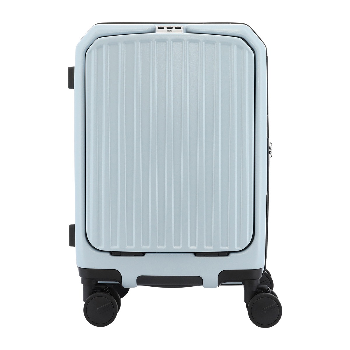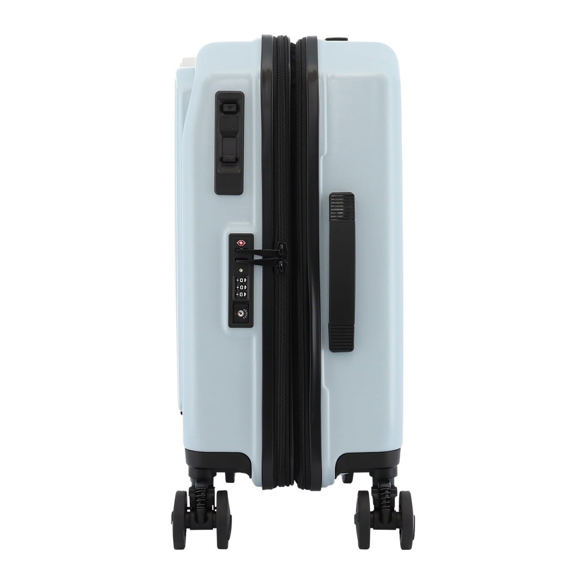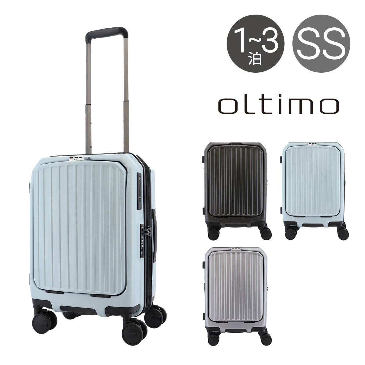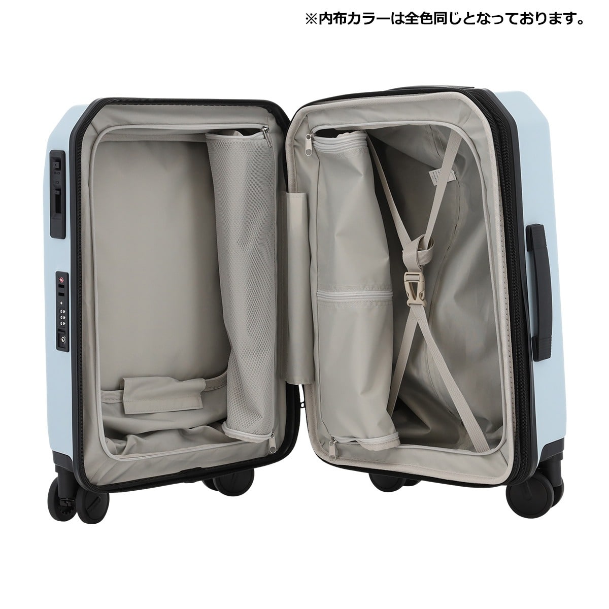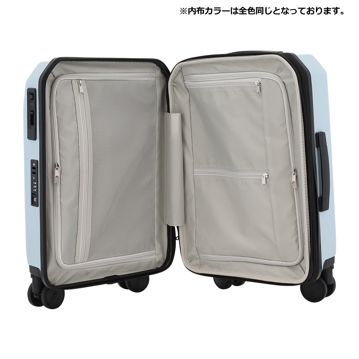 仕様:ダブルファスナー式開閉内側:固定ベルト×1仕切り幕(ファスナーポケット×2)×1仕切り幕(ファスナーメッシュポケット×2)×1前面:金具式(ファスナーポケット×1ファスナーメッシュポケット×1)仕切り幕(ベルクロポケット×1フリーポケット×2)×1キャリーバー三段階調節エキスパンダブル機能ワンタッチストッパー TSロック搭載8輪キャスターフロントオープンタイプ