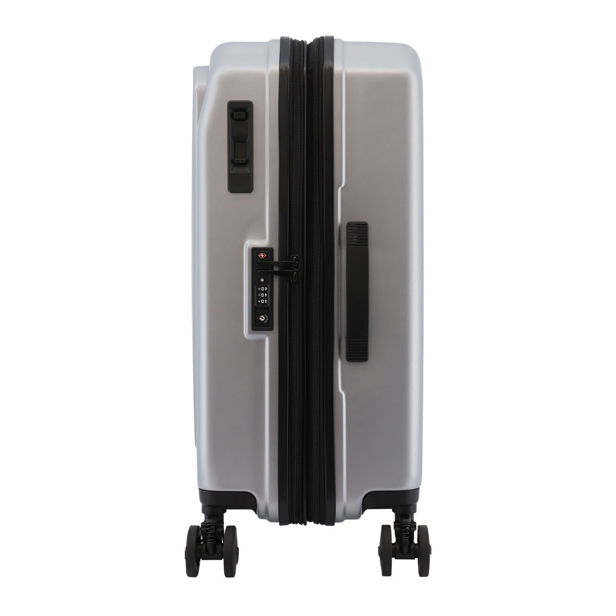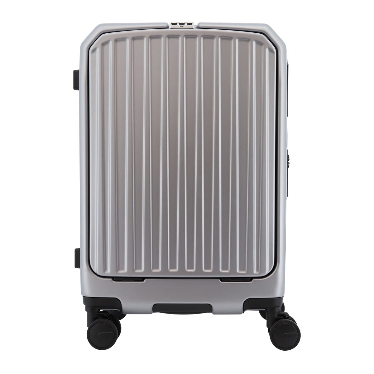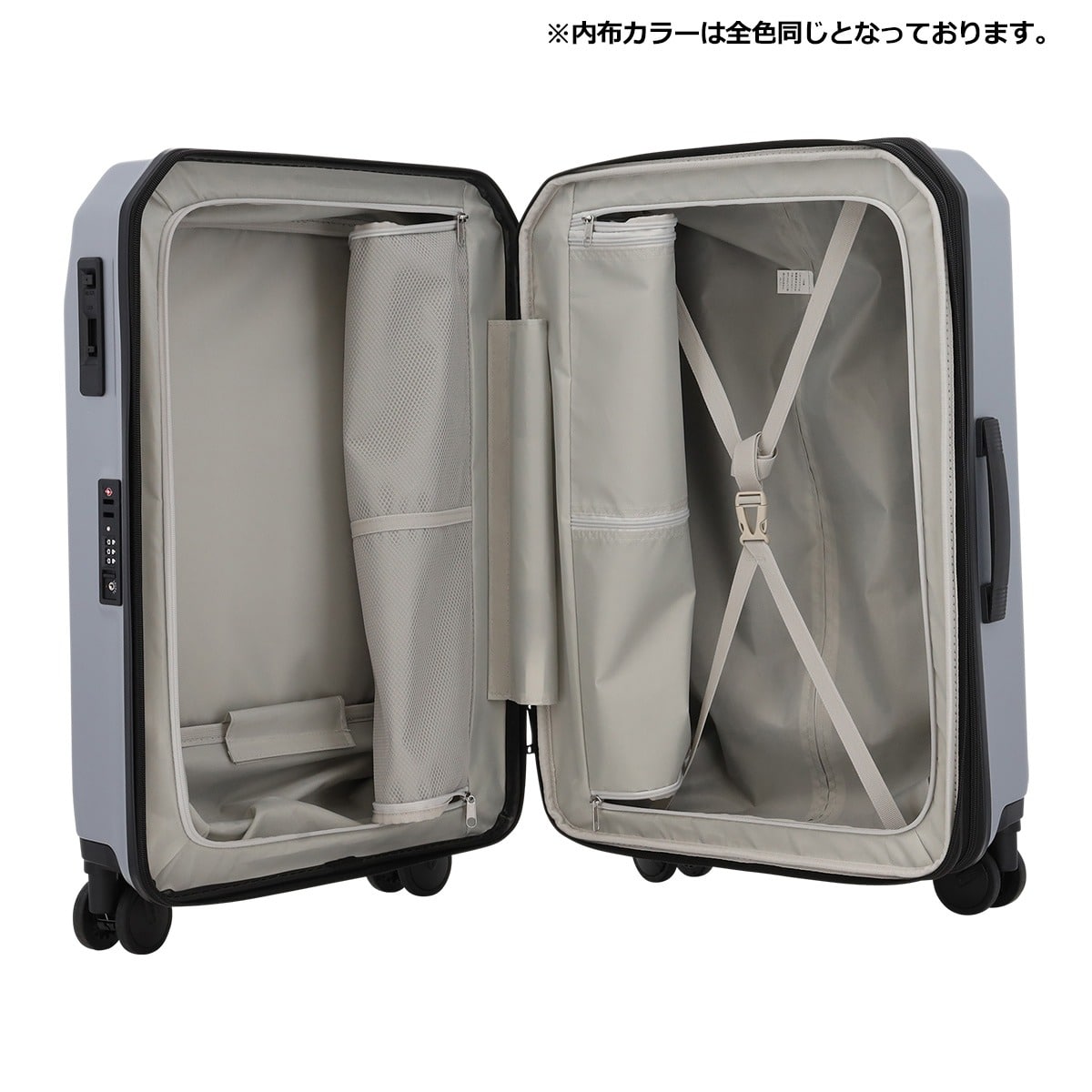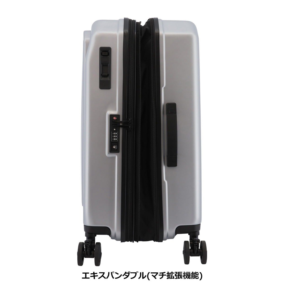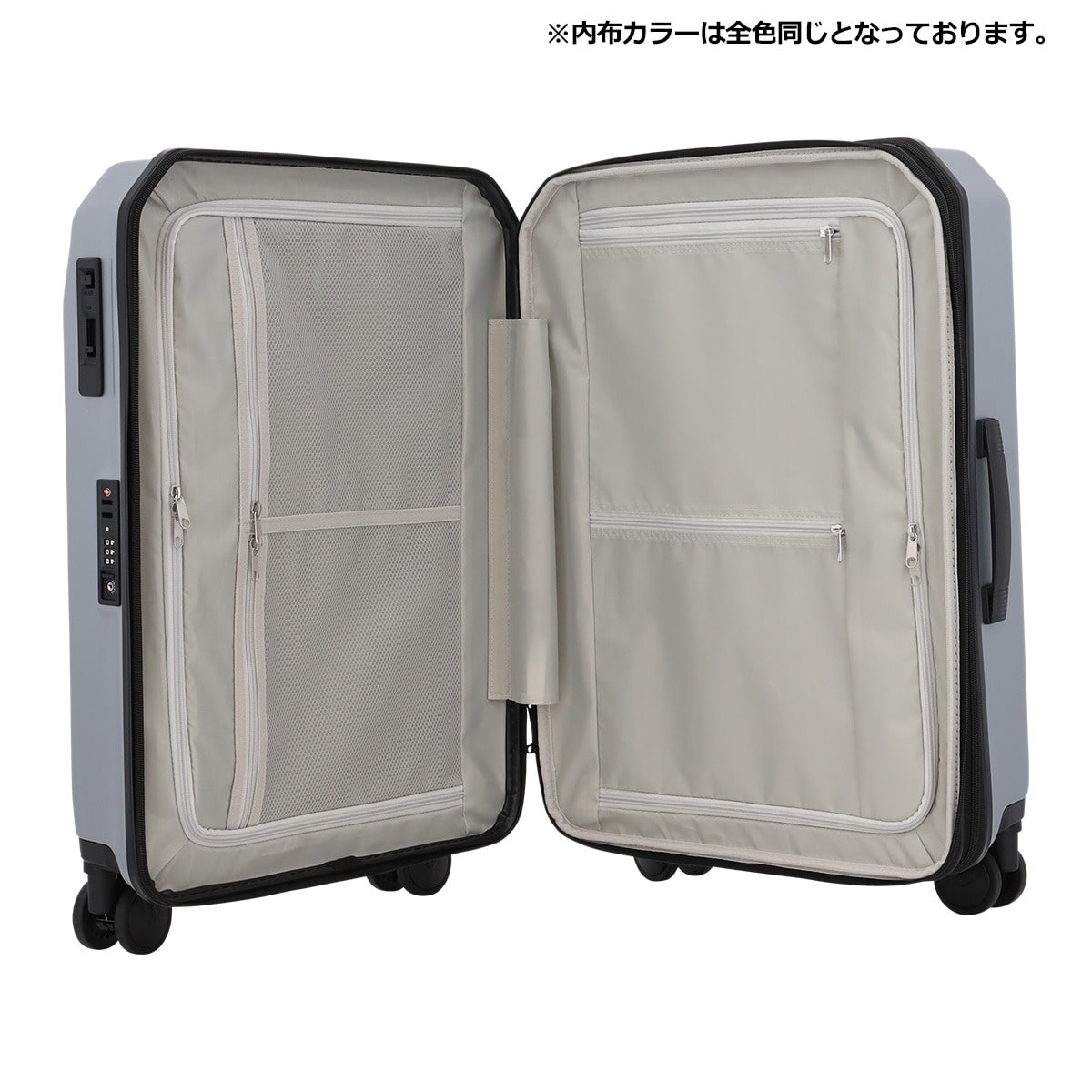 仕様:ダブルファスナー式開閉内側:固定ベルト×1仕切り幕(ファスナーポケット×2)×1仕切り幕(ファスナーメッシュポケット×2)×1前面:金具式(ファスナーポケット×1ファスナーメッシュポケット×1)仕切り幕(ベルクロポケット×1フリーポケット×2)×1キャリーバー三段階調節エキスパンダブル機能ワンタッチストッパー TSロック搭載8輪キャスターフロントオープンタイプ