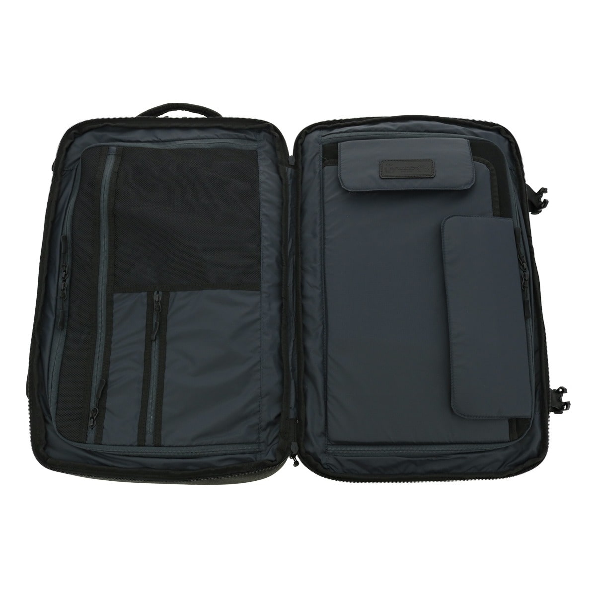 仕様:ダブルファスナー式開閉内側:ダブルファスナーポケット×2(内側:ベルクロ式PCポケット×1)ファスナーポケット×1ファスナーメッシュポケット×1ベルクロ式PCポケット×1前面:ファスナーポケット×1ダブルファスナーポケット×1(内側:ファスナーポケット×1、フリーポケット×1、ペンホルダー×2)背面:ダブルファスナーポケット×1リュックベルト収納ポケット×1エキスパンダブル機能(内側:ダブルファスナーポケット×1)キャリーセットアップチェストベルト