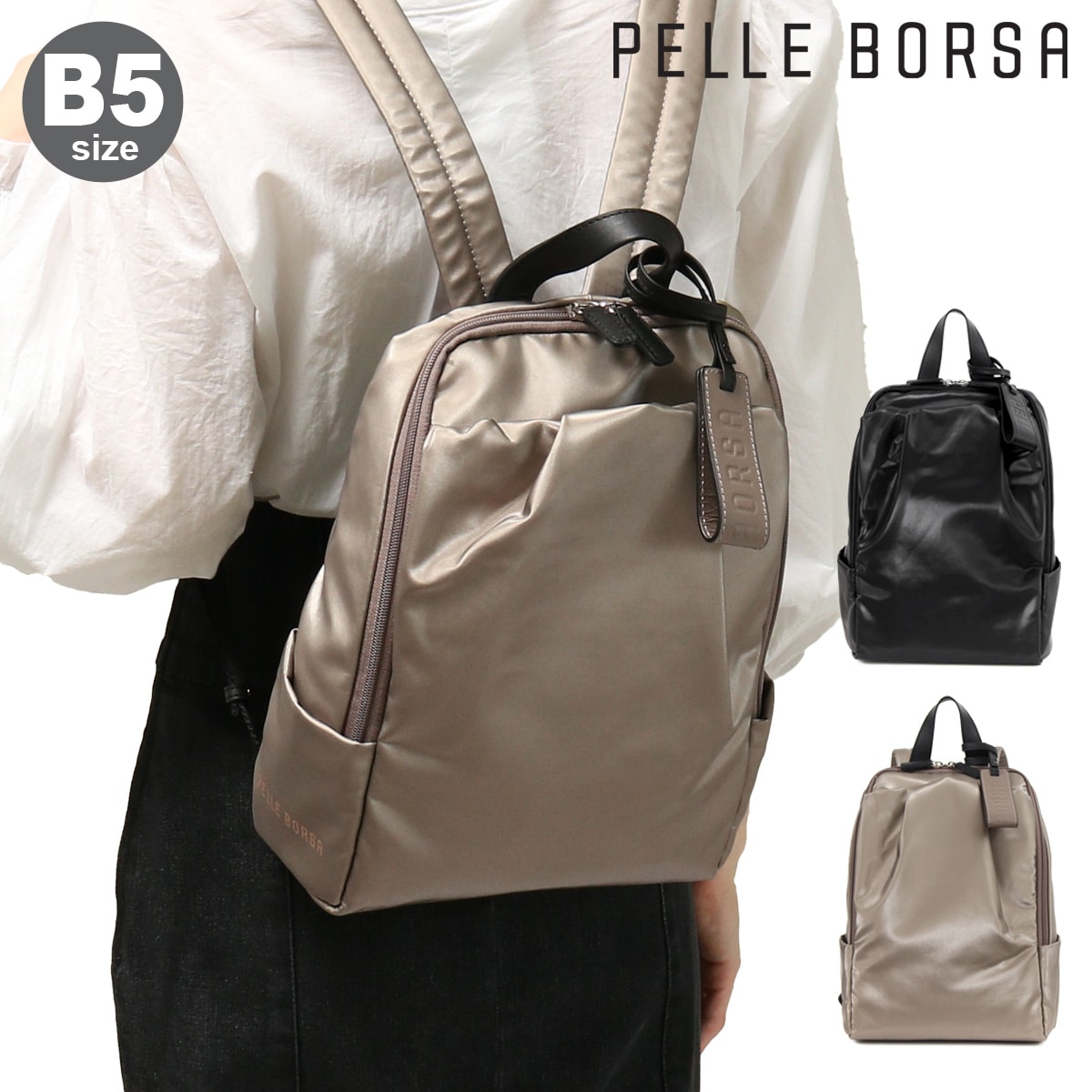毎日を忙しく、頑張っている女性を応援するCheersシリーズです。オンにもオフにも使えるミドルサイズリュックです。背面はメッシュ素材を使用し、通気性を高めています。後ろファスナーは本体内装に直接アクセスでき使いやすさも抜群です。