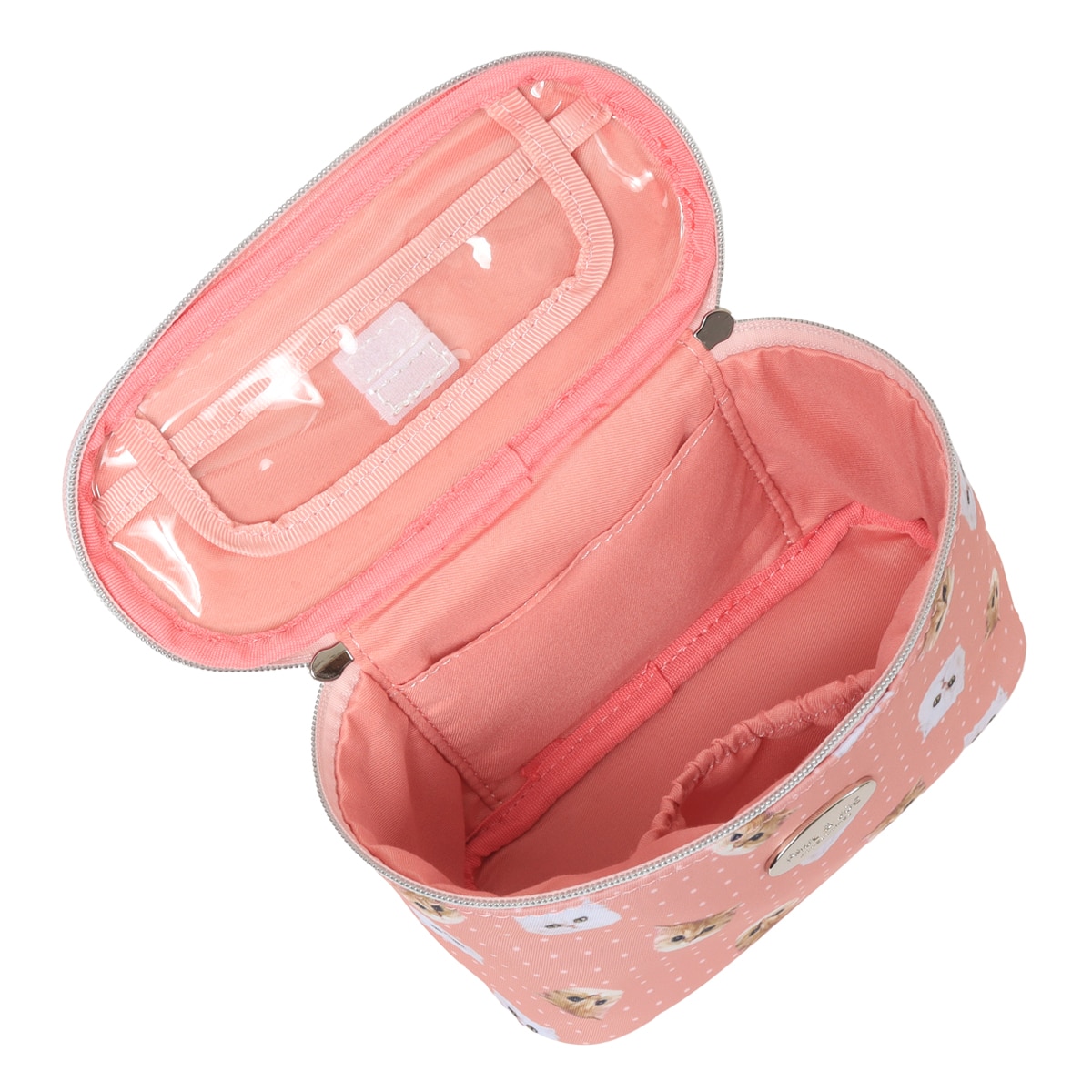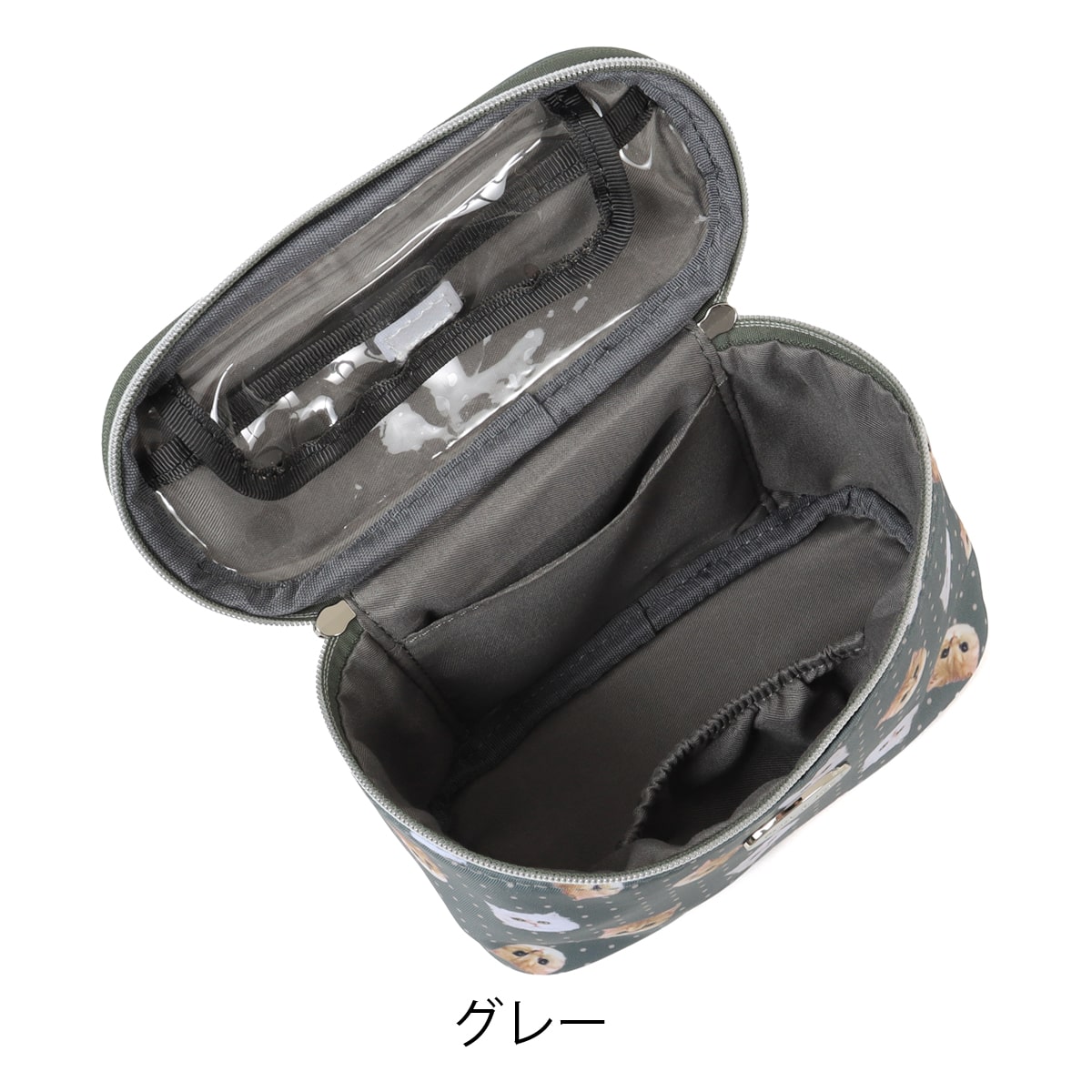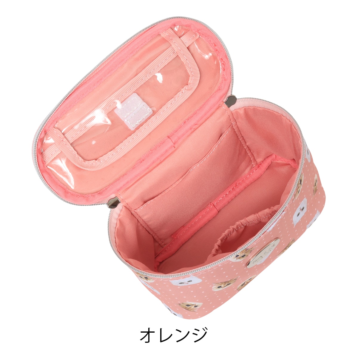 ジプシー&ヌネットの総柄が可愛い持ち手付きポーチです。スリムなバニティタイプなのでバッグの中でもかさばらずにスッキリと収納できます。フタ部分に付いているクリアポケットはブラシなどを入れるのに便利。ラウンド型のロゴ入りシルバープレートがポイント。