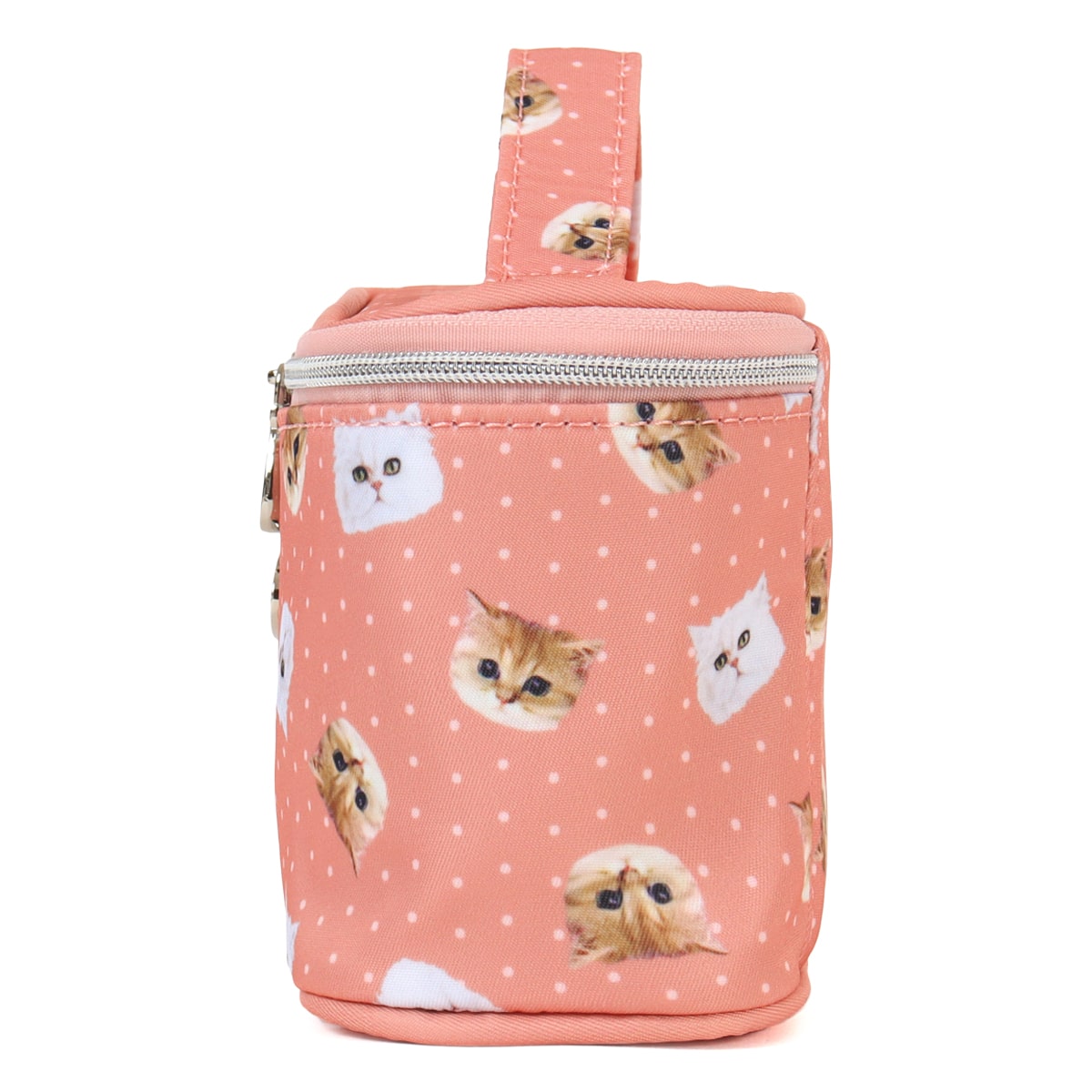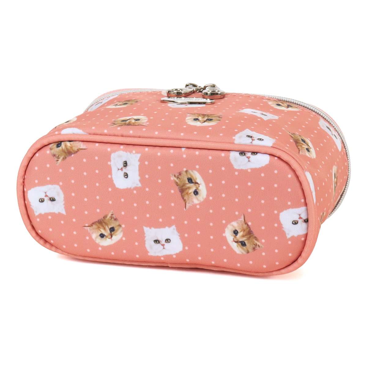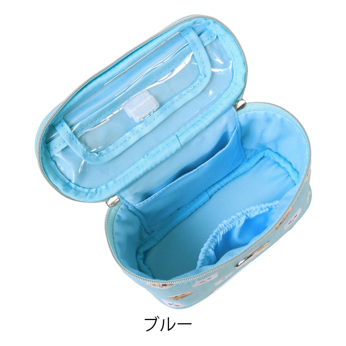 ジプシー&ヌネットの総柄が可愛い持ち手付きポーチです。スリムなバニティタイプなのでバッグの中でもかさばらずにスッキリと収納できます。フタ部分に付いているクリアポケットはブラシなどを入れるのに便利。ラウンド型のロゴ入りシルバープレートがポイント。