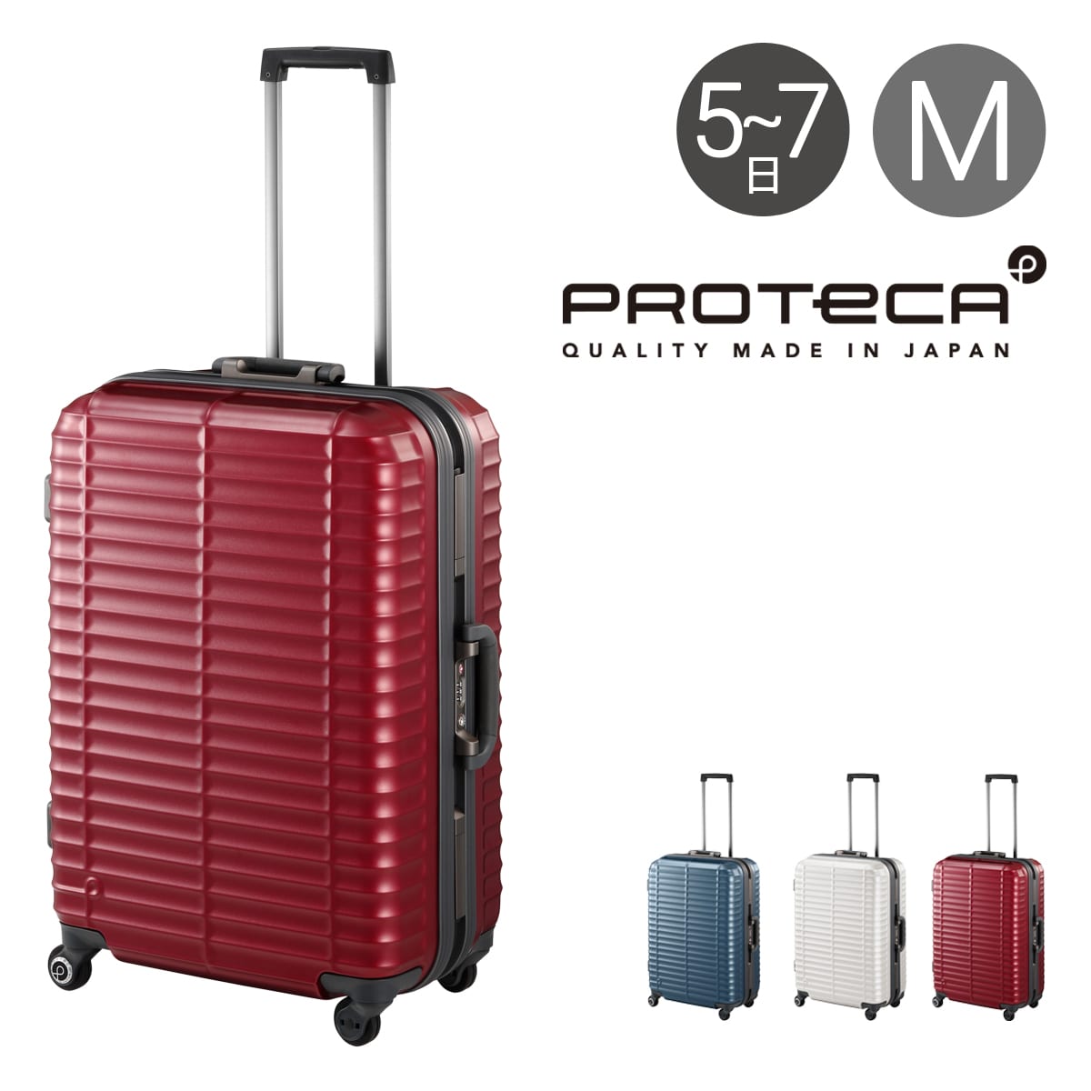 PROTECA Stratum|軽量・硬質なマグネシウム合金フレームと「ストラタム」=「層」の様に連なる水平リブが、スーツケースに必要な強度を確保します。ロックにはTSAダイヤル錠を採用。キャスター:体感音量を大幅に軽減した「サイレントキャスター」に加え、なめらかな走行を実現した「ベアロンホイール」を採用。