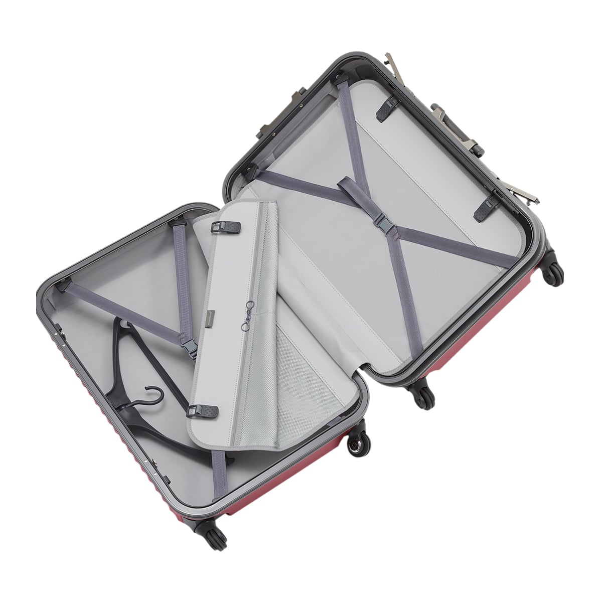 仕様:フレームタイプ内側:ワンタッチ式仕切り幕×2クロスベルト×2立体ハンガー×1静音サイレントキャスター採用なめらか走行ベアロンホイール採用キャリーバー多段階調整可ダイヤル式TSAロック搭載
