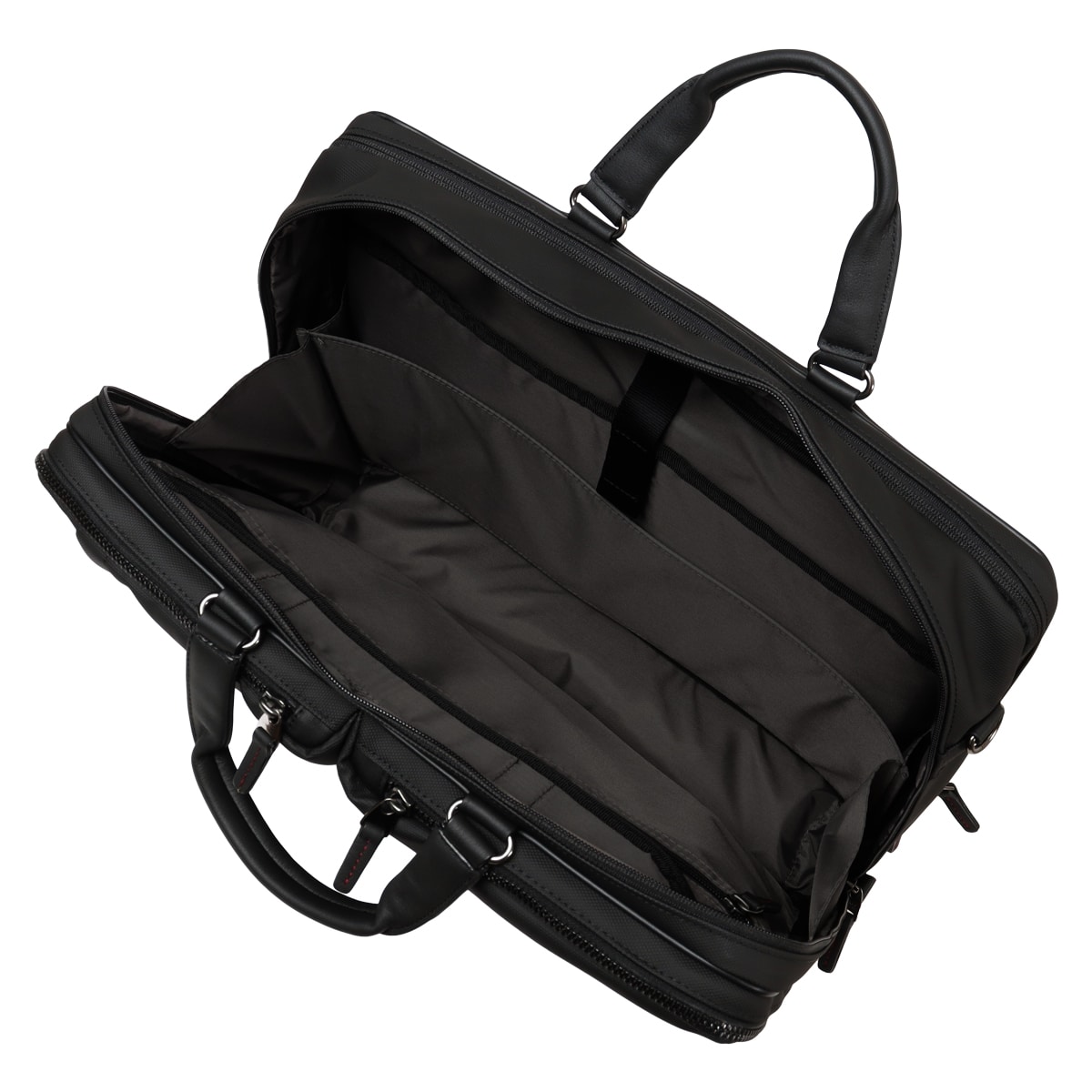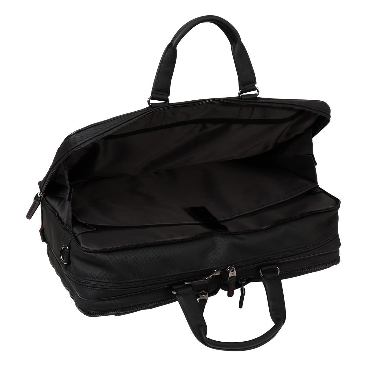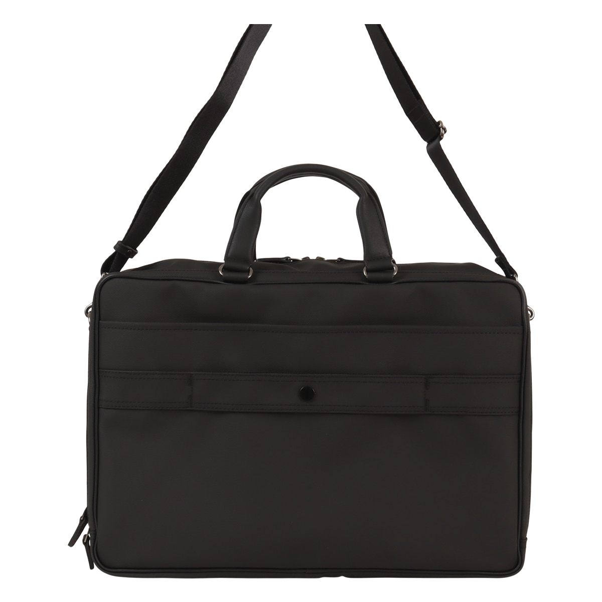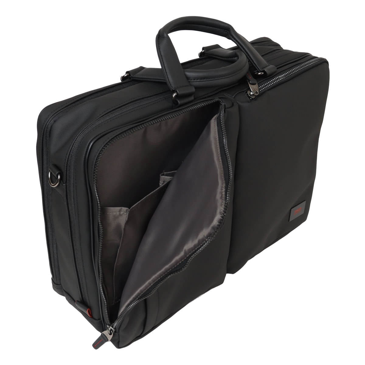 出張にも対応したタケオキクチのB4サイズビジネスバッグ。斜め掛けとしても使える肩紐付きの2WAYバッグです。従来の出社型「オフィスワーク」と、自宅やシェアオフィスなどオフィスと離れた場所で働く「テレワーク」を組み合わせた働き方が増えた中で柔軟に対応できるよう、15.6インチノートパソコンの持ち運びに対応しています。オールブラックでどんなシーンでも使いやすいビジネスバッグですが、ポイントにさりげなくワイン色を施しています。収納機能抜群で、普段の通勤から短期出張まで幅広く使えるビジネスバッグです。