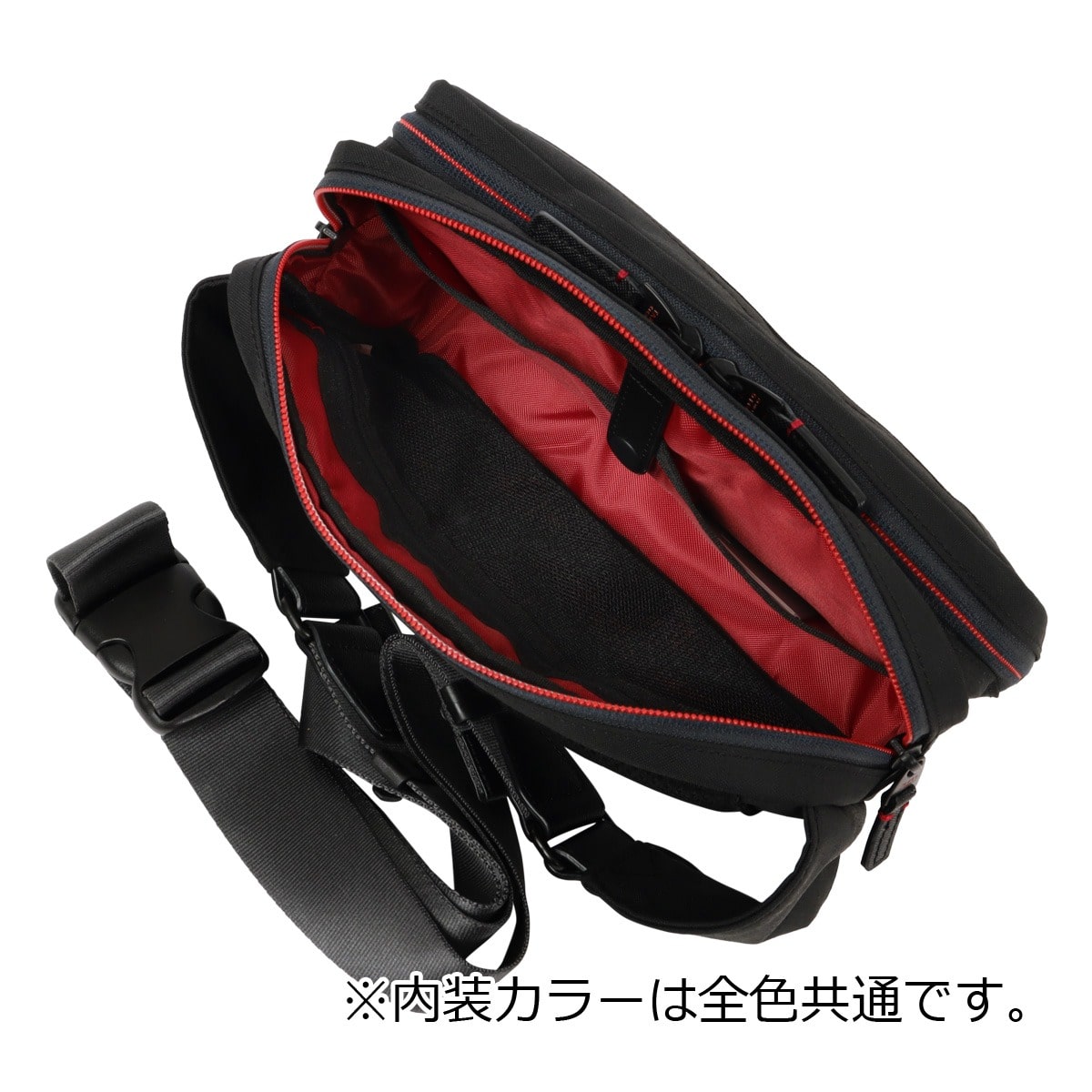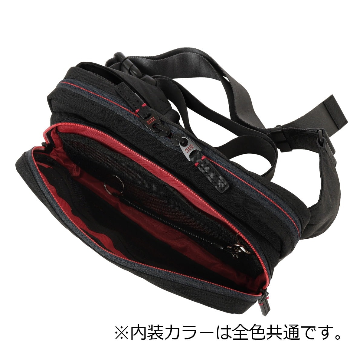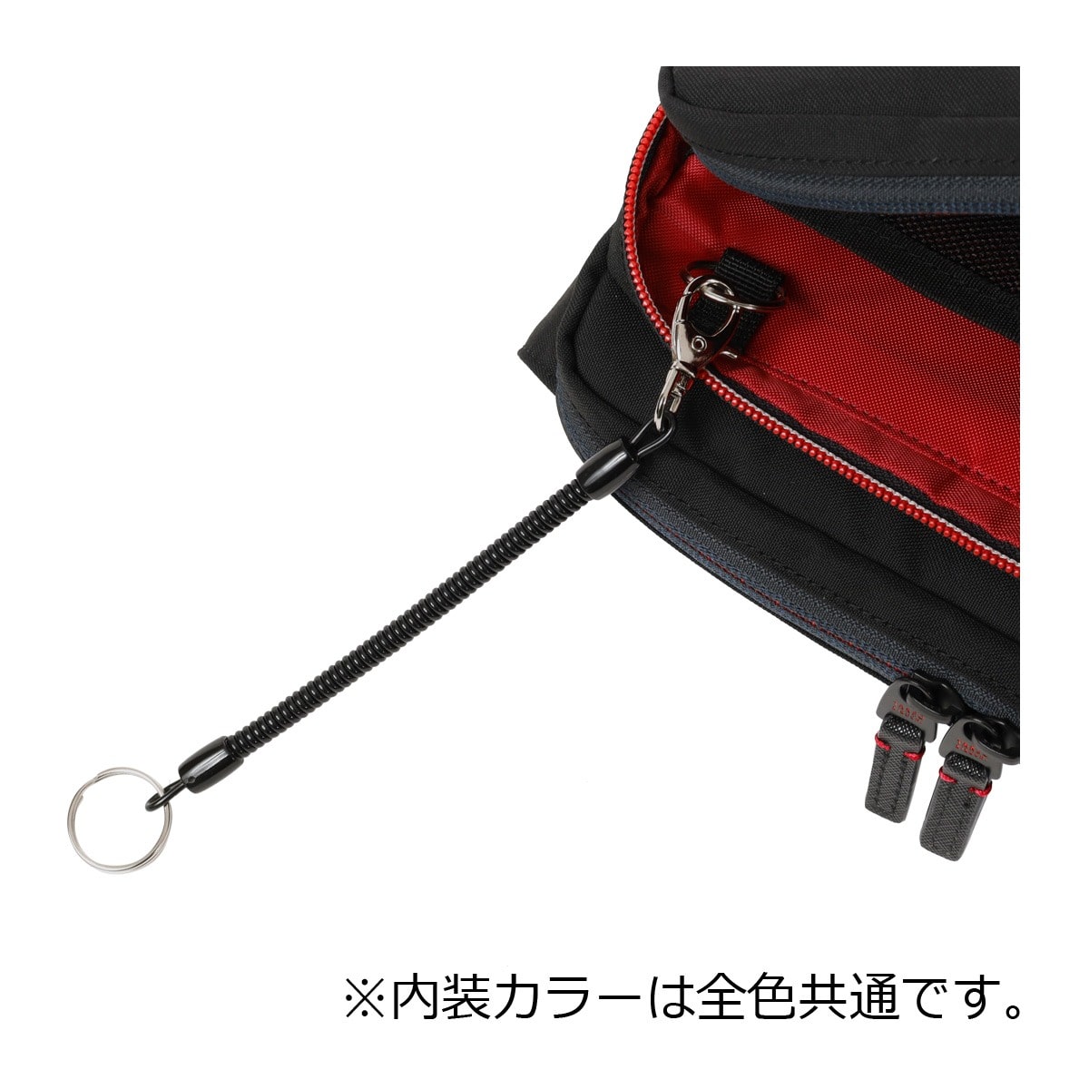 仕様:ダブルファスナー式開閉内側:前室:ファスナーポケット×1フリーポケット×2キーチェーンフック×1後室:ファスナーポケット×1スナップボタンポケット×1前面:ファスナーポケット×1