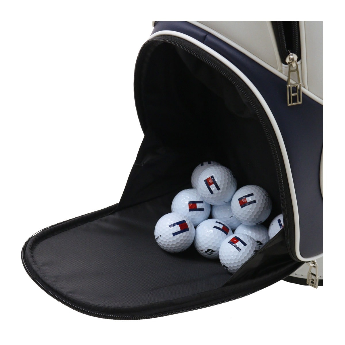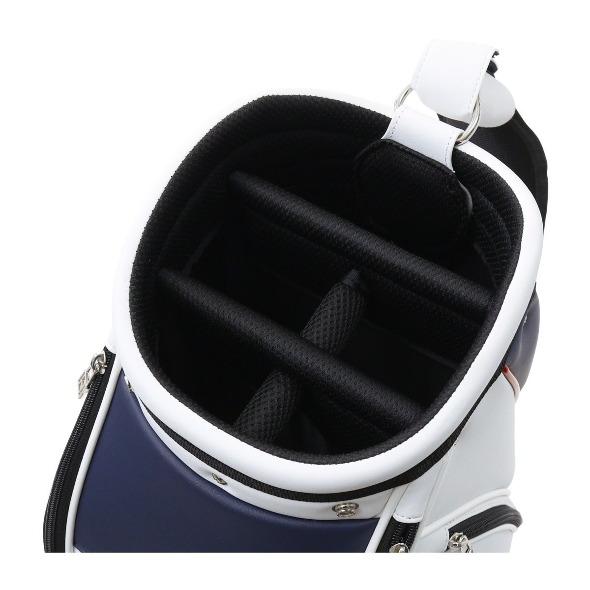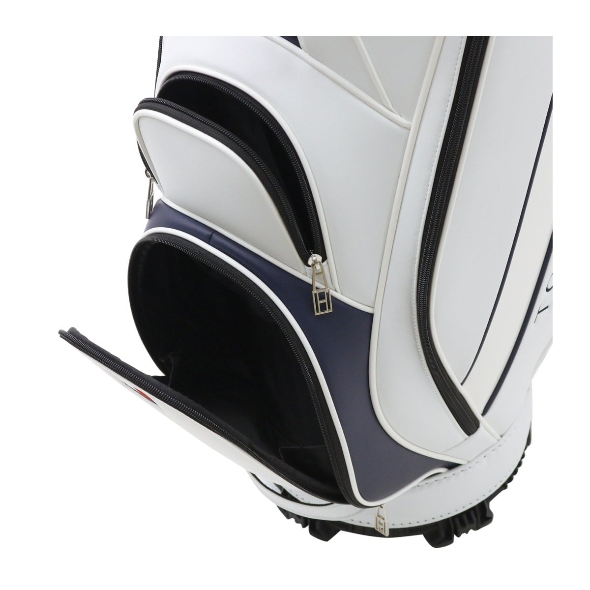 カートタイプのキャディバッグ。シンプルな造りに軽量シボ合皮を使用している為、軽く、持ち運びの時に負担が軽減され快適にお使いいただけます。ブランドイメージを落とし込んだベーシックなアイテムです。ポケット6個。口枠5分割。セパレーター3分割。