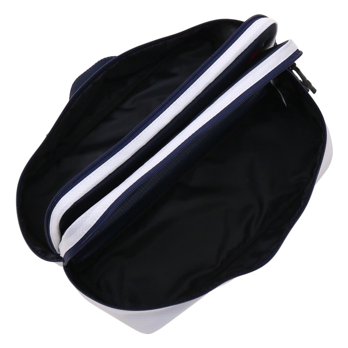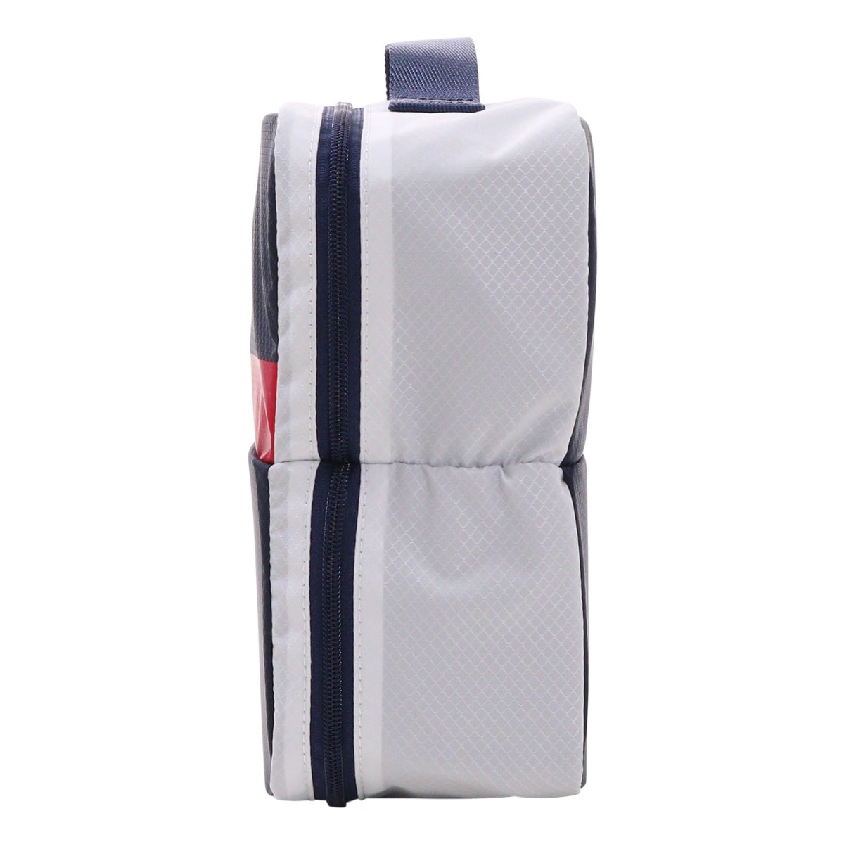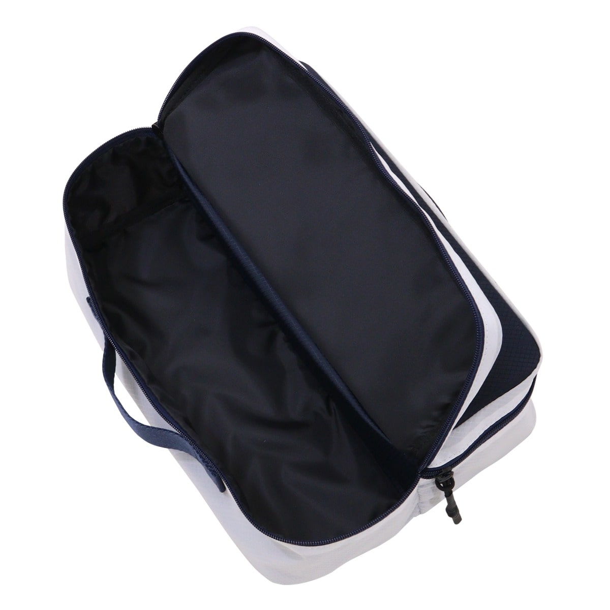 シンプルなデザインのシューズケース。内装が2層になっており、シューズを片足ずつ入れる仕様です。シューズを入れていない時は半分に折り曲げ、マチ部分は収縮可能。