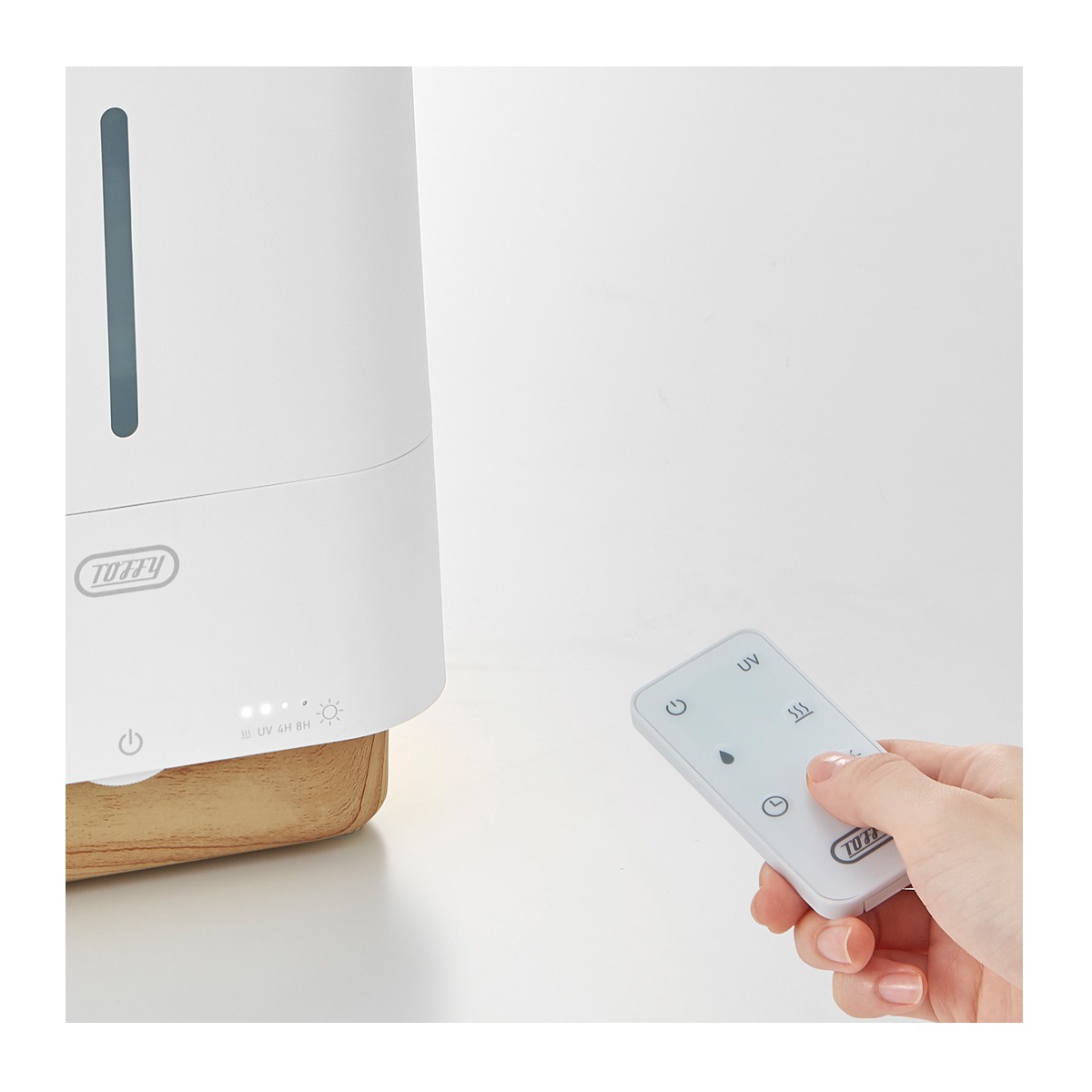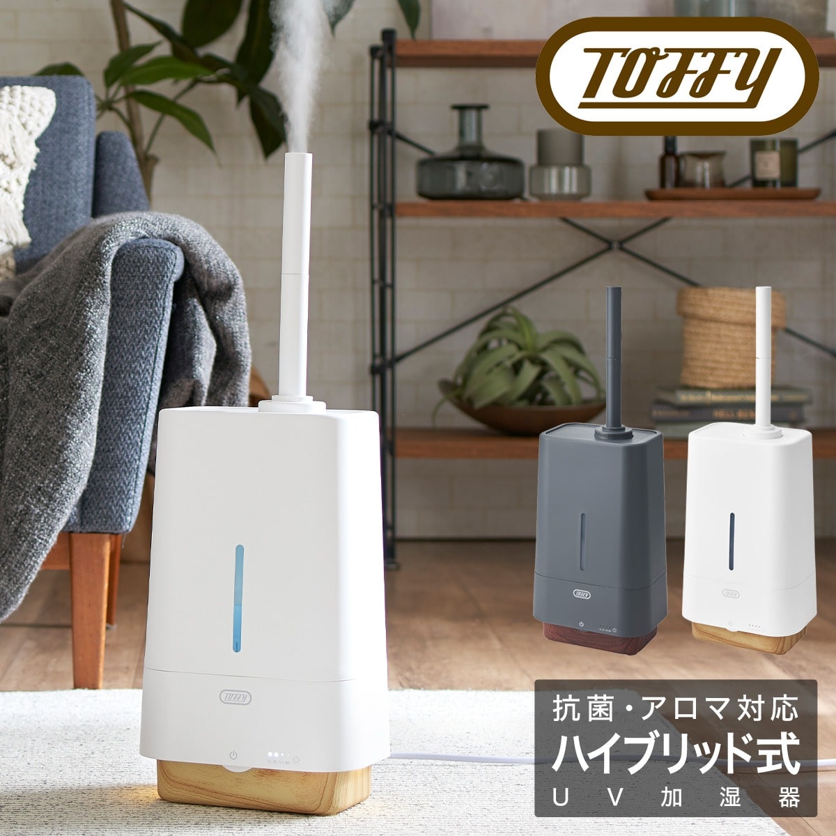 加熱式と超音波式を組み合わせたハイブリッドタイプ。加熱した水をミスト化し噴霧させることでより効率よく加湿でき、本体内に紫外線による除菌効果のあるUVライトも備えた清潔・安心な加湿器です。本体には銀系無機抗菌剤を練り込んだ樹脂を使用。無加工製品との比較で細菌の増殖割合が100分の1以下の抗菌効果を実現。ヌメリや赤カビも抑制し、より清潔にお使いいただけます。無機抗菌剤を練り込んだ抗菌樹脂採用で、SIAA(抗菌製品技術協議会)認証を取得しています。抗菌素材に加え、本体内に紫外線による除菌効果のあるUV ラ イトも備えた清潔・安心な加湿器。清潔なミストを噴霧させ ることが可能です。加熱した水をミスト化し噴霧させることでより効率よく加湿できる加湿器です。ミストは火傷の心配もないため、お子様やペットがいるご家庭でも安心してお使いいただけます。また室温を大きく下げずに加湿できるのも寒い時期には嬉しいポイントです。4時間・8時間から選べる自動運転OFFのタイマーモード付き。水タンクは上から簡単に水を注ぎ入れることができる上部給水型で給水もしやすい加湿器です。リモコン付きで離れた場所からでも操作できます。電源ケーブルが本体から取り外せるので、水捨てやお手入れの際にとても便利。保管の時も邪魔になりません。水タンクにアロマオイル・アロマウォーターを直接入れることが可能です。たっぷりのミストに乗せてお好きな香りがお部屋に漂います。