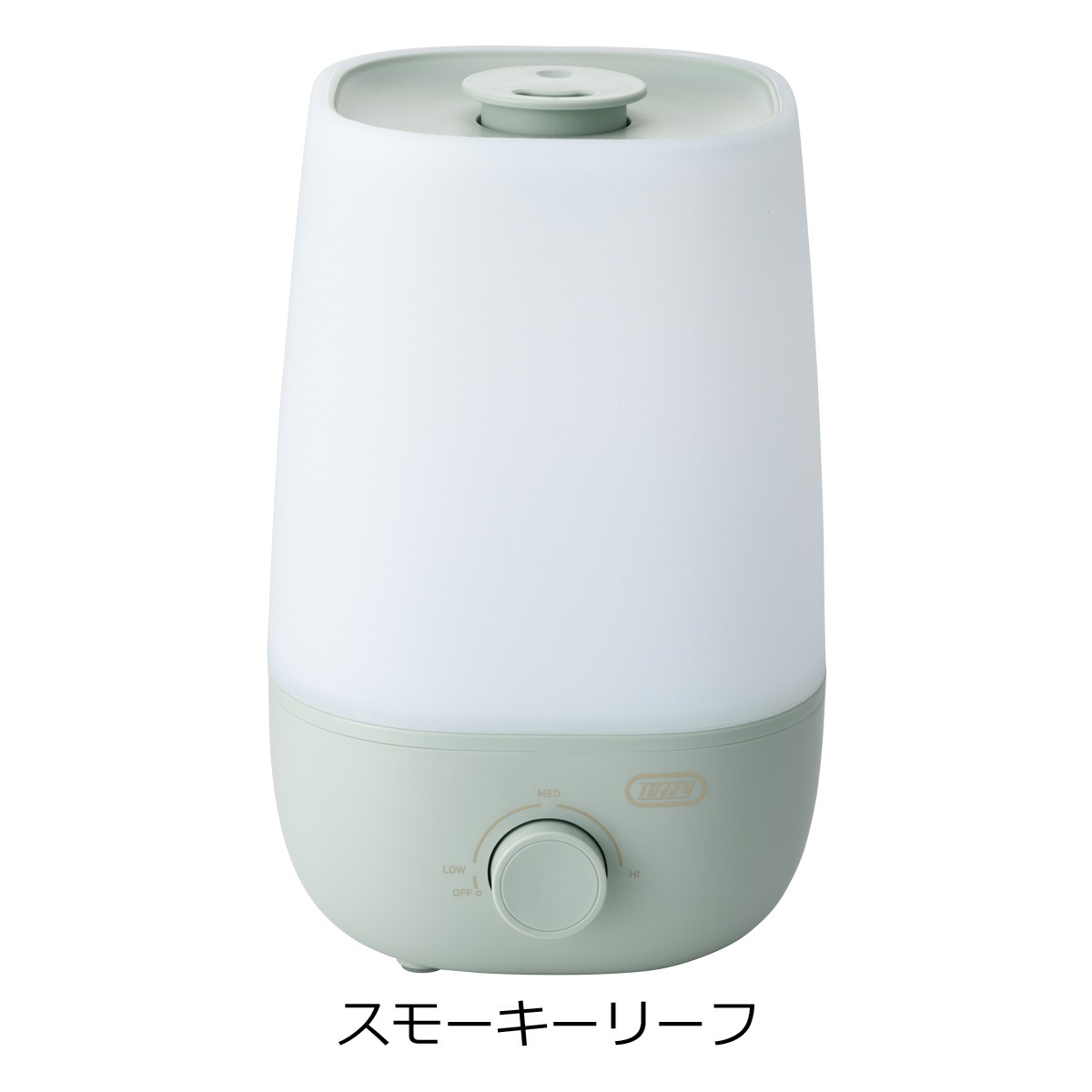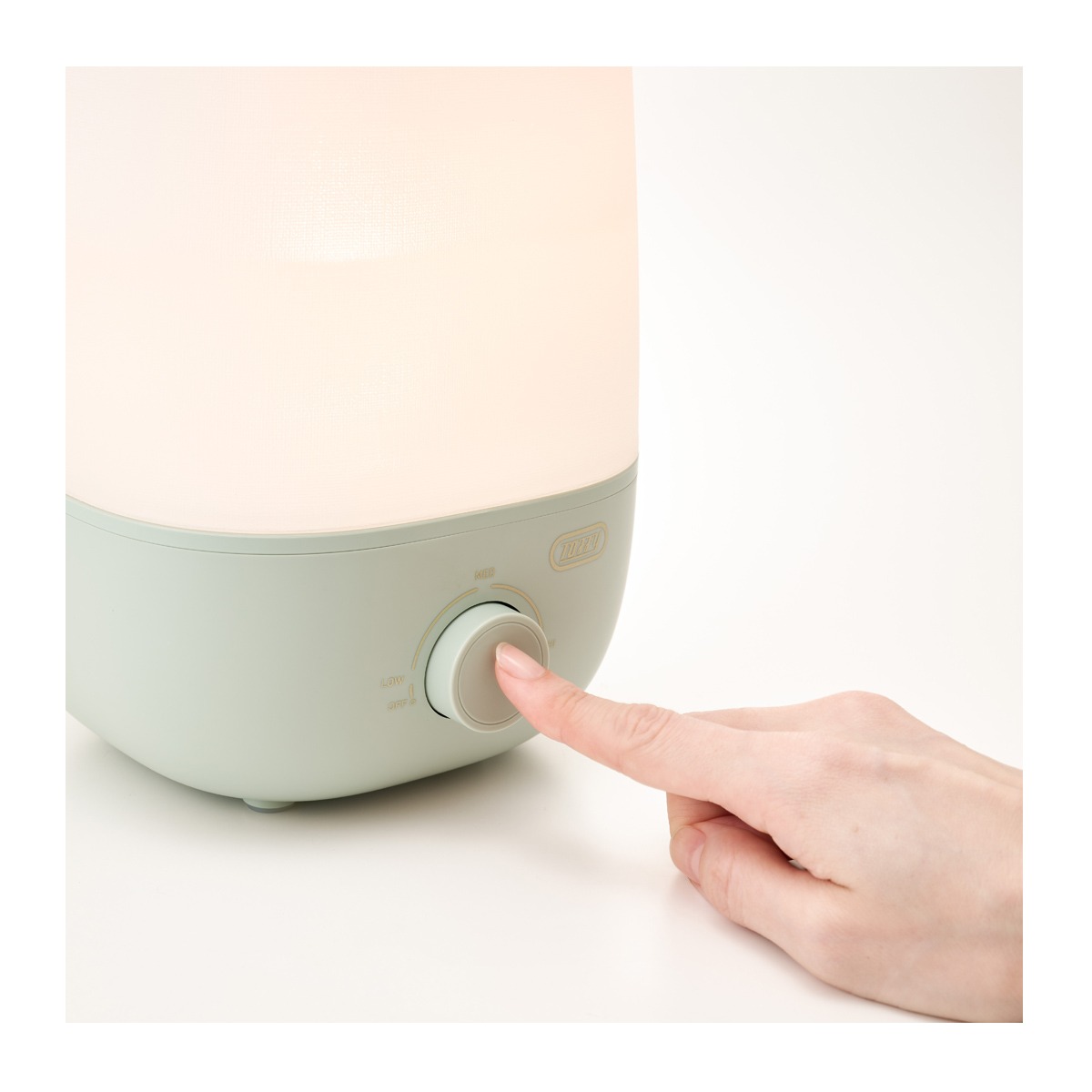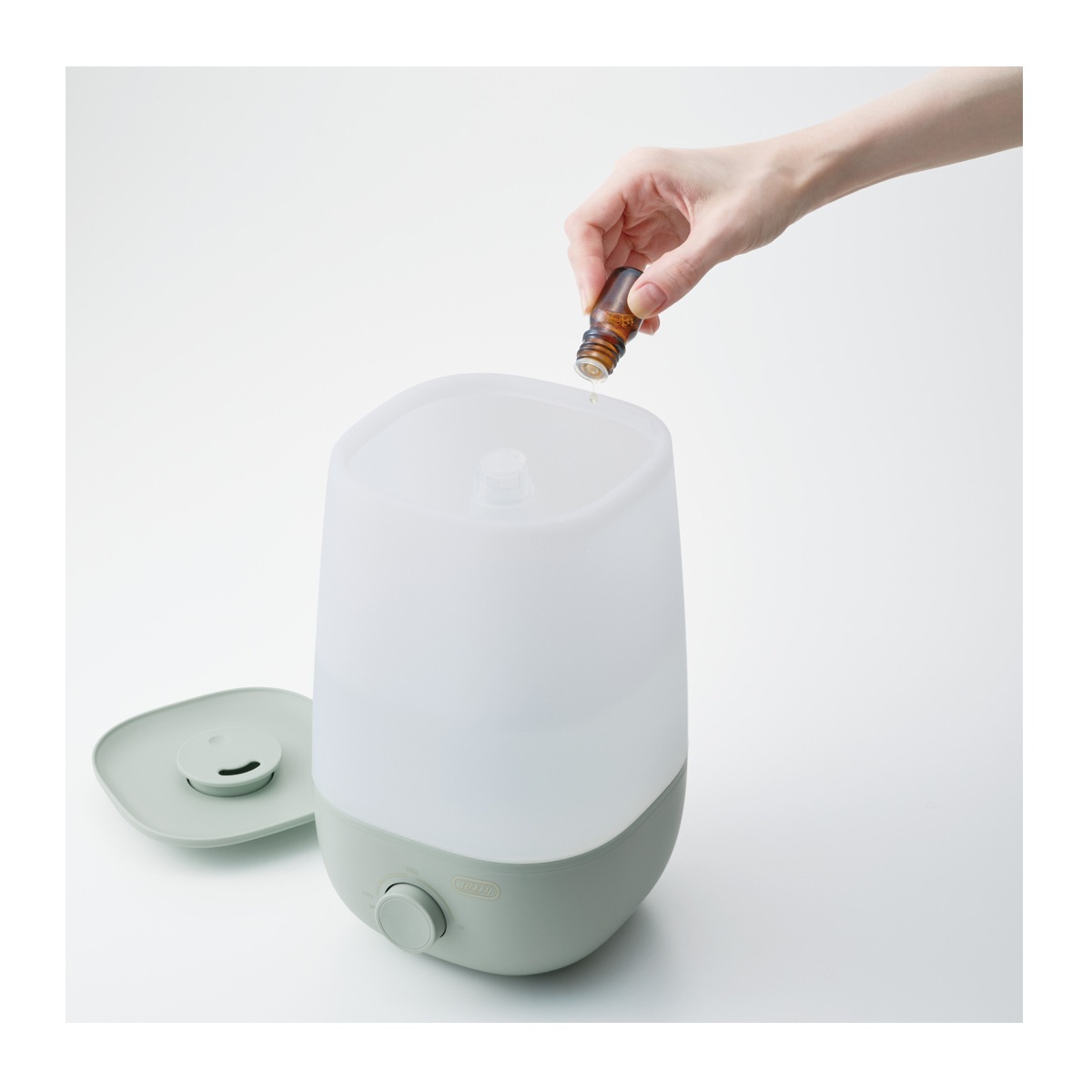 床置きでも卓上でも使えるちょうどいいサイズの加湿器。エッセンシャルオイルやアロマウォーター対応で、水タンクに滴下すればミストとともに香りを楽しむことができます。すりガラスのような水タンクから灯るライトが、お部屋をやさしく照らしながら空気を潤します。