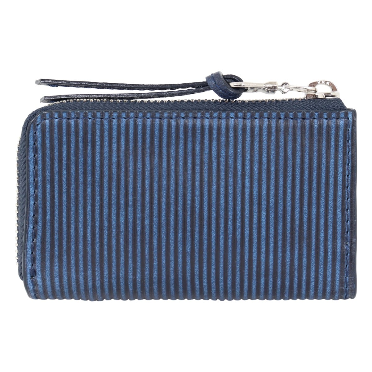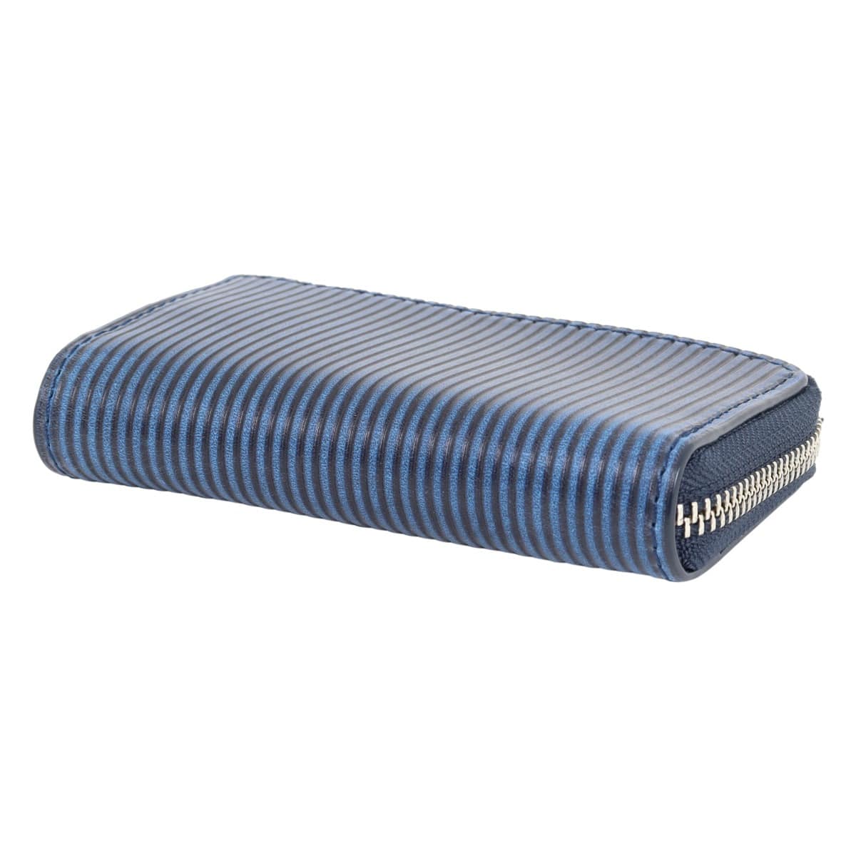 牛革藍染め加工×ストライプ型押し加工。ストライプの型押しを施し、弱めの削りを施すことで、あたたかみのある風合いを生み出しました。ほどよい濃淡の陰影が美しく、スッキリと引き締まったシャープな雰囲気に仕上げています。L字式開閉で開閉しやすくスマートキー専用ホルダーもあり非常に使い回しがしやすいアイテムとなっております。内側は明るい白ヌメカラーのすることで、メリハリのあるデザインに仕上げています。
