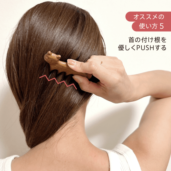 コームを頭皮にあて、前後にジグザクと小刻みに軽く動かしながら、ツボをおしたり、コリをほぐしてください。