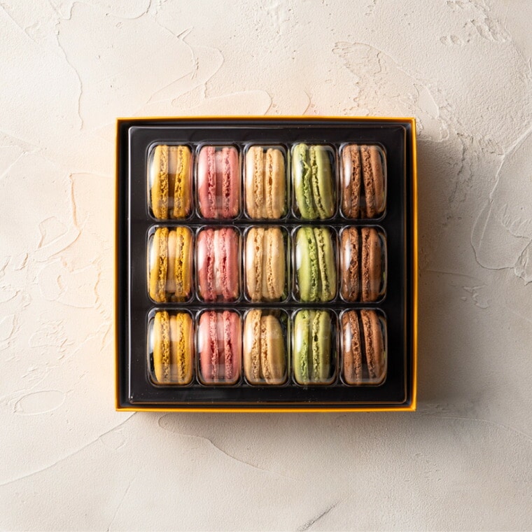 ●原材料:砂糖(国内製造)、クリーム、チョコレート、アーモンド粉、液卵白、バター、ココアバター、レモン果汁、牛乳、加糖卵黄、凍結卵、カカオマス、ピスタチオペースト、粉末水飴、ローズシロップ、転化糖、水飴、ジャスミン茶葉、レモン果皮、乾燥卵白、コーンスターチ、ココアパウダー、大豆たんぱく分解物/香料、乳化剤、着色料(ラック、黄4、銀箔、赤2、カカオ、クロロフィル、青1)、pH調整剤、酸味料、安定剤(増粘多糖類)、トレハロース、(一部に卵・乳成分・大豆・アーモンドを含む)