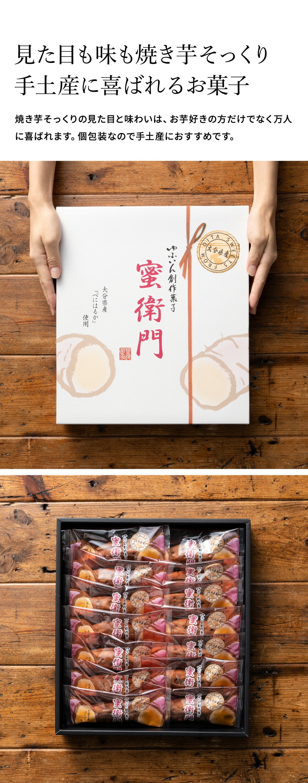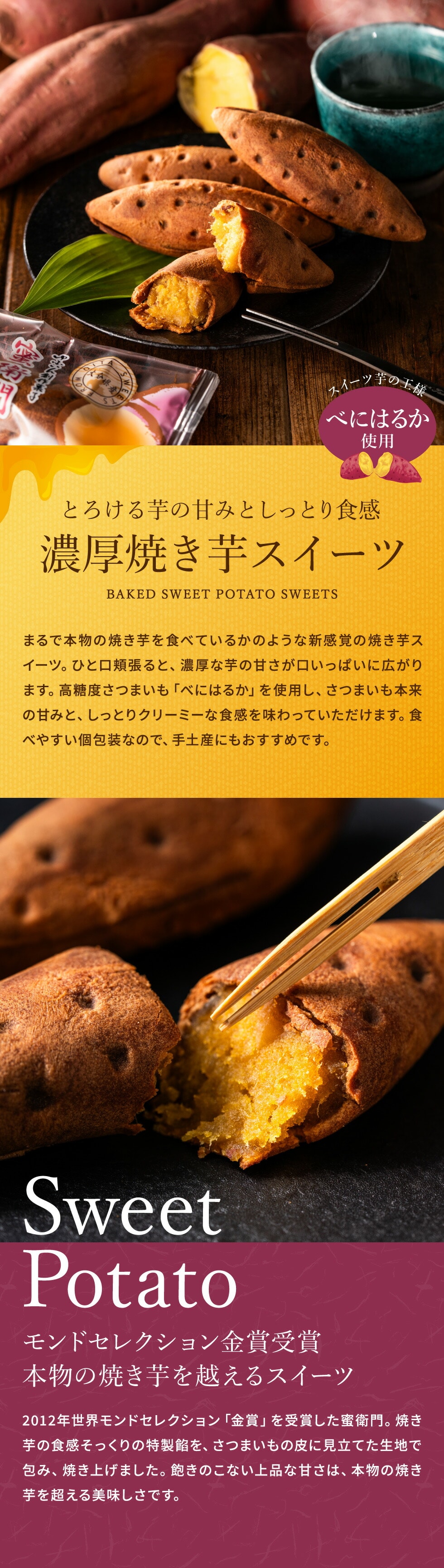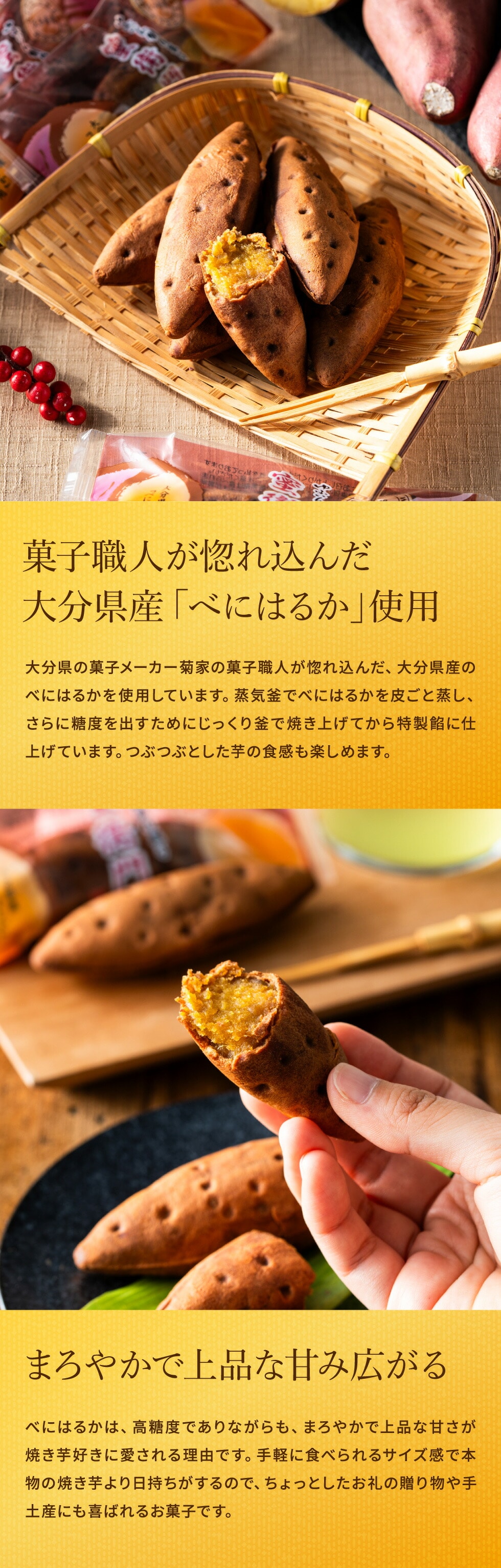 ●材料 : さつま芋(べにはるか)(大分県産)、砂糖、小麦粉、和三盆糖蜜、マーガリン、全卵、加糖卵黄、乳等を主要原料とする食品、バター、水飴、蒟蒻加工品、食塩/トレハロース、着色料(カラメル、クチナシ、コチニール、紅麹、カロチン、V.B2)、膨張剤、香料、乳化剤、安定剤(アルギン酸Na、CMC、増粘多糖類)、リン酸塩(K、Na)、水酸化Ca、酸化防止剤(V.E)、(一部に卵、乳成分、小麦、大豆を含む)