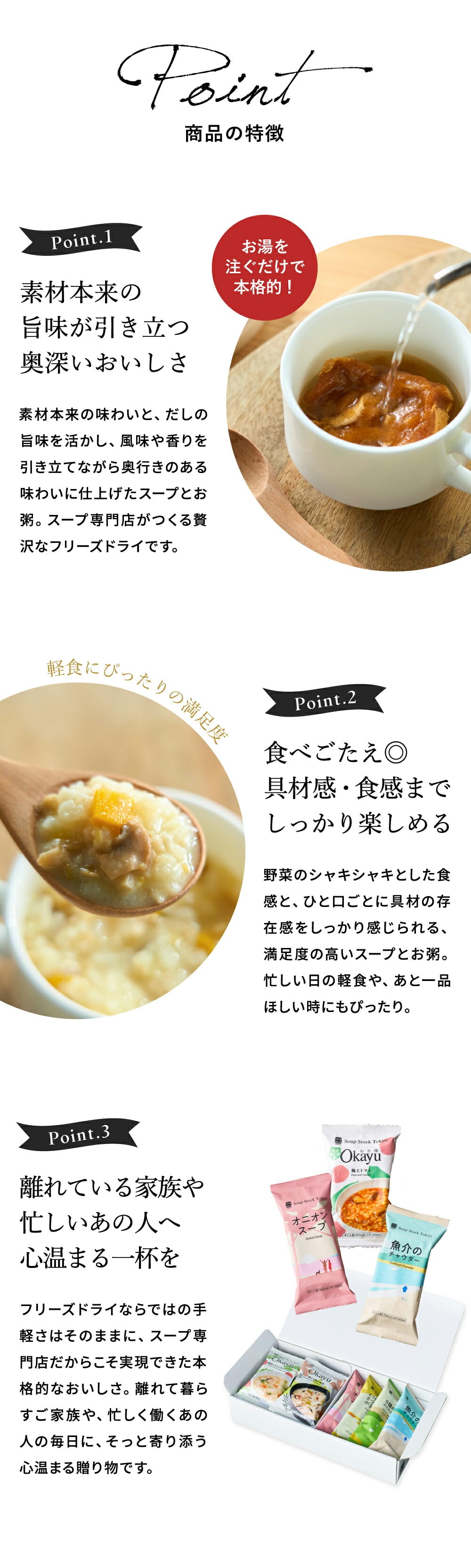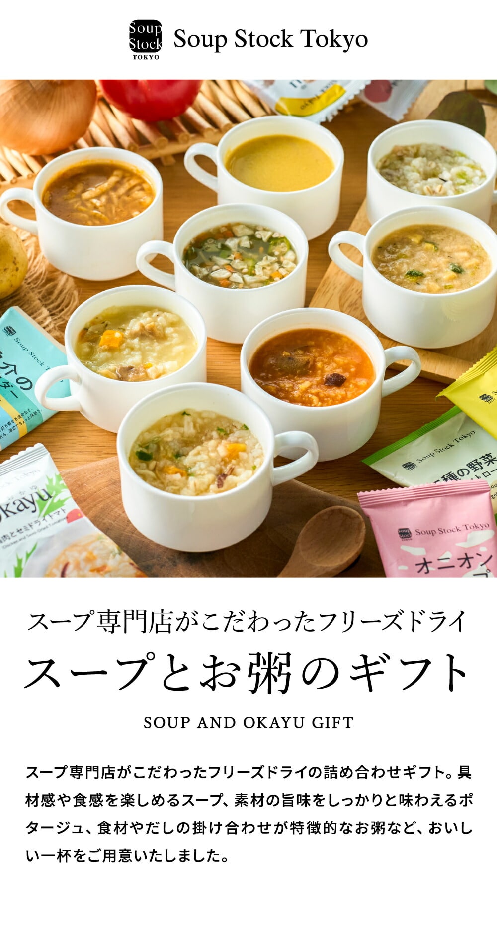 ●内容量:Soup オニオンスープ14.7g・Soup 5種の野菜のミネストローネ11.8g・Soup 魚介のチャウダー17.0g・Soup とうもろこしとさつま芋のポタージュ20.5g・Okayu 2種のきのことチーズ21.4g・Okayu 鶏肉とセミドライトマト17.4g・Okayu 鯛と3種の海藻16g・Okayu 梅とトマト16.3g