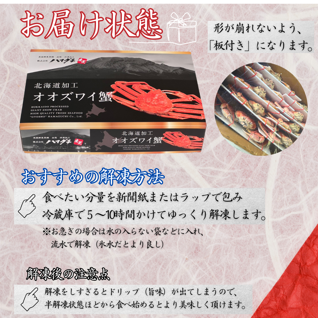 北海道の豊かな海「噴火湾」で育まれたオオズワイガニを、茹で上げ後すぐに急速冷凍。 鮮度そのままの旨みと上品な甘みを閉じ込めました。 ご家庭でも贅沢なひとときをお楽しみいただけます。