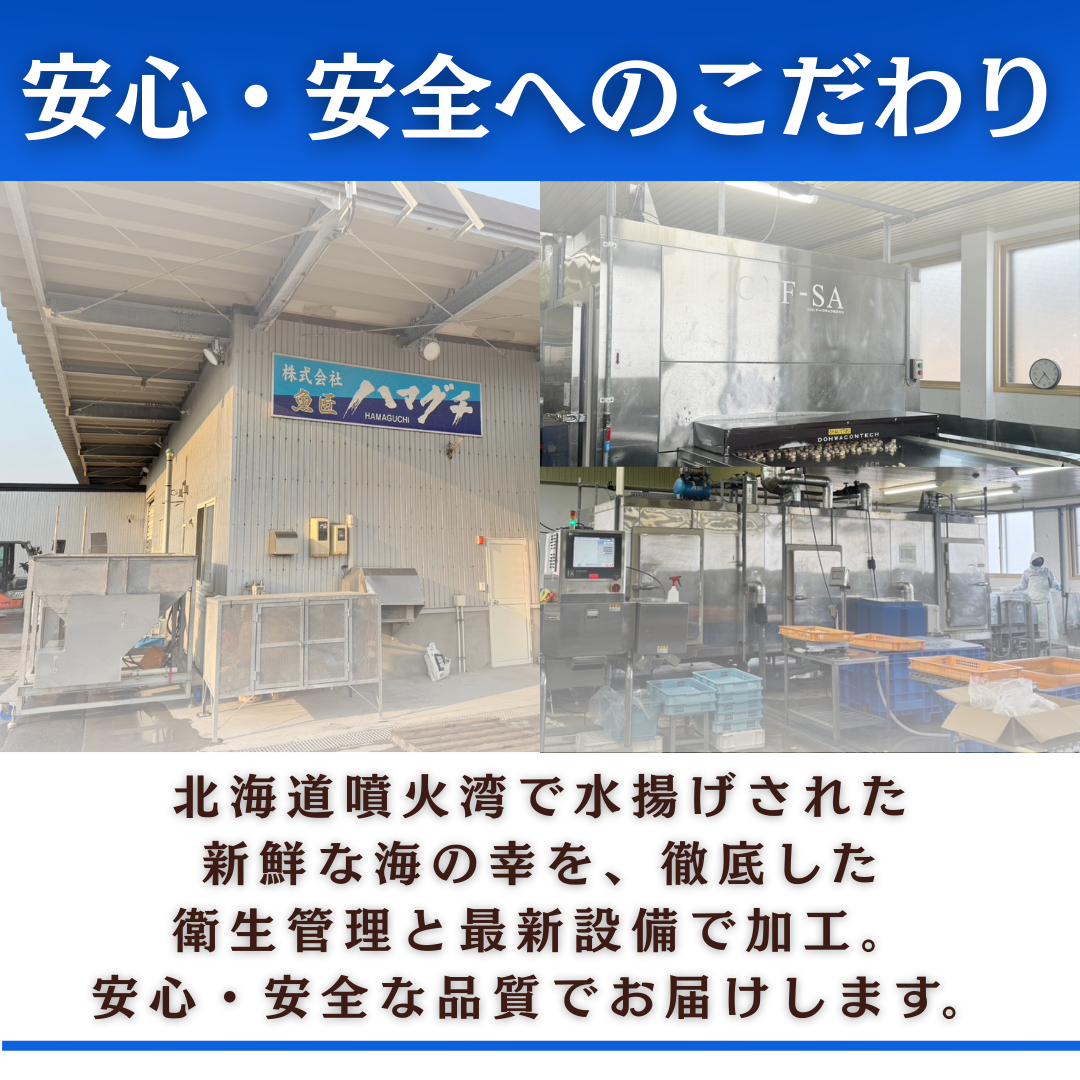 ご家庭用はもちろん、贈答品・お歳暮・お祝いとしても安心してお選びいただけます。 北海道噴火湾産の確かな美味しさを、ぜひ大切な方とご一緒にご堪能ください。
