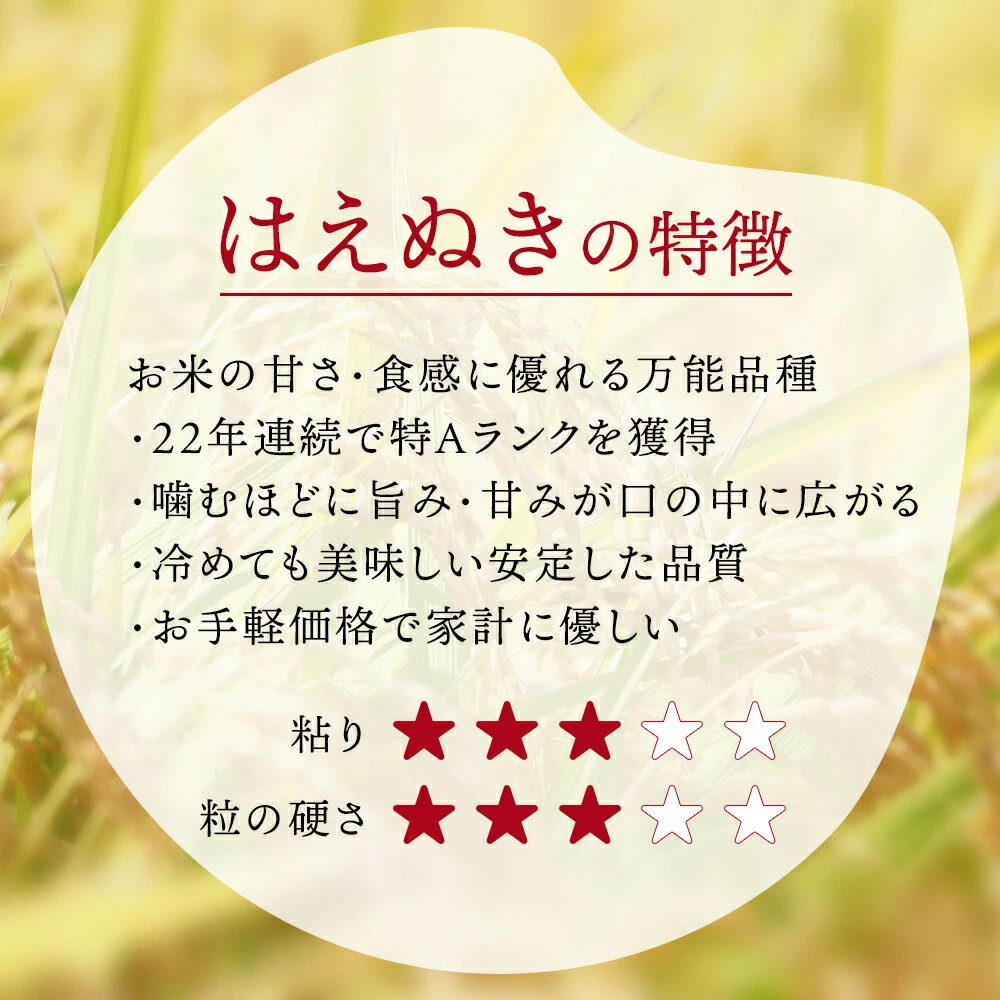 米どころ山形県を代表する人気品種「はえぬき」を、産地直送でお届けします。 出荷元で精米してから発送するため、精米したてならではの香りと甘みをお楽しみいただけます。 炊きあがりは粒立ちが良く、冷めても味が落ちにくいため、 毎日の食卓はもちろん、お弁当やおにぎりにも使いやすいお米です。