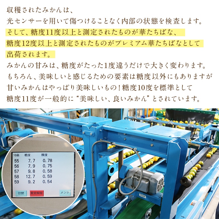 光センサーで糖度11度選果を行い、個体ごとの味や甘みのバラつきが少なく