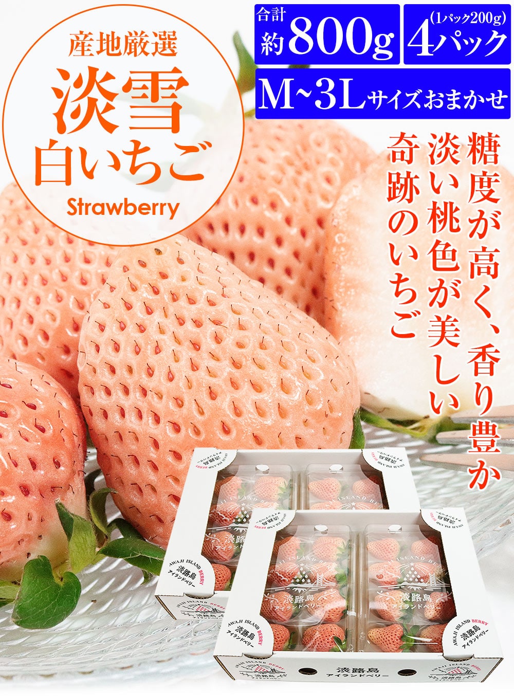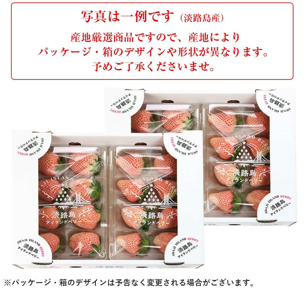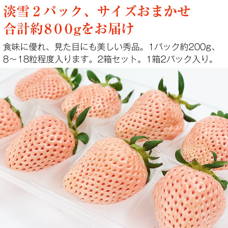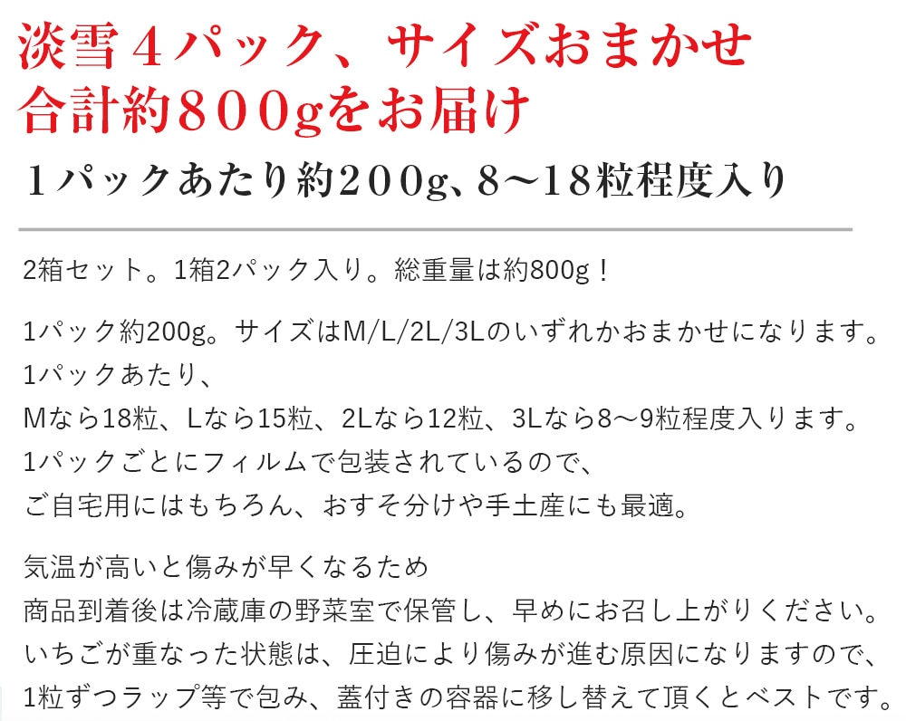2箱セット。1箱2パック入り。総重量約800g!M/L/2L/3Lのいずれか、いちごのサイズはおまかせです。