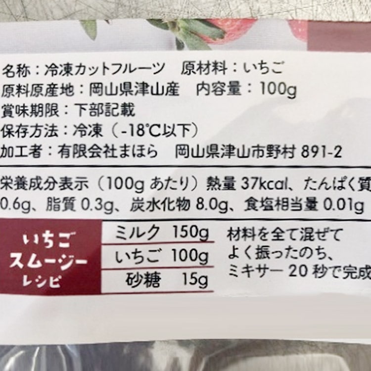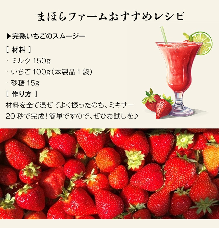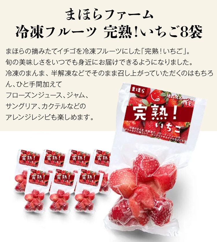 まほらの摘みたてイチゴを冷凍フルーツにした「完熟!いちご」。