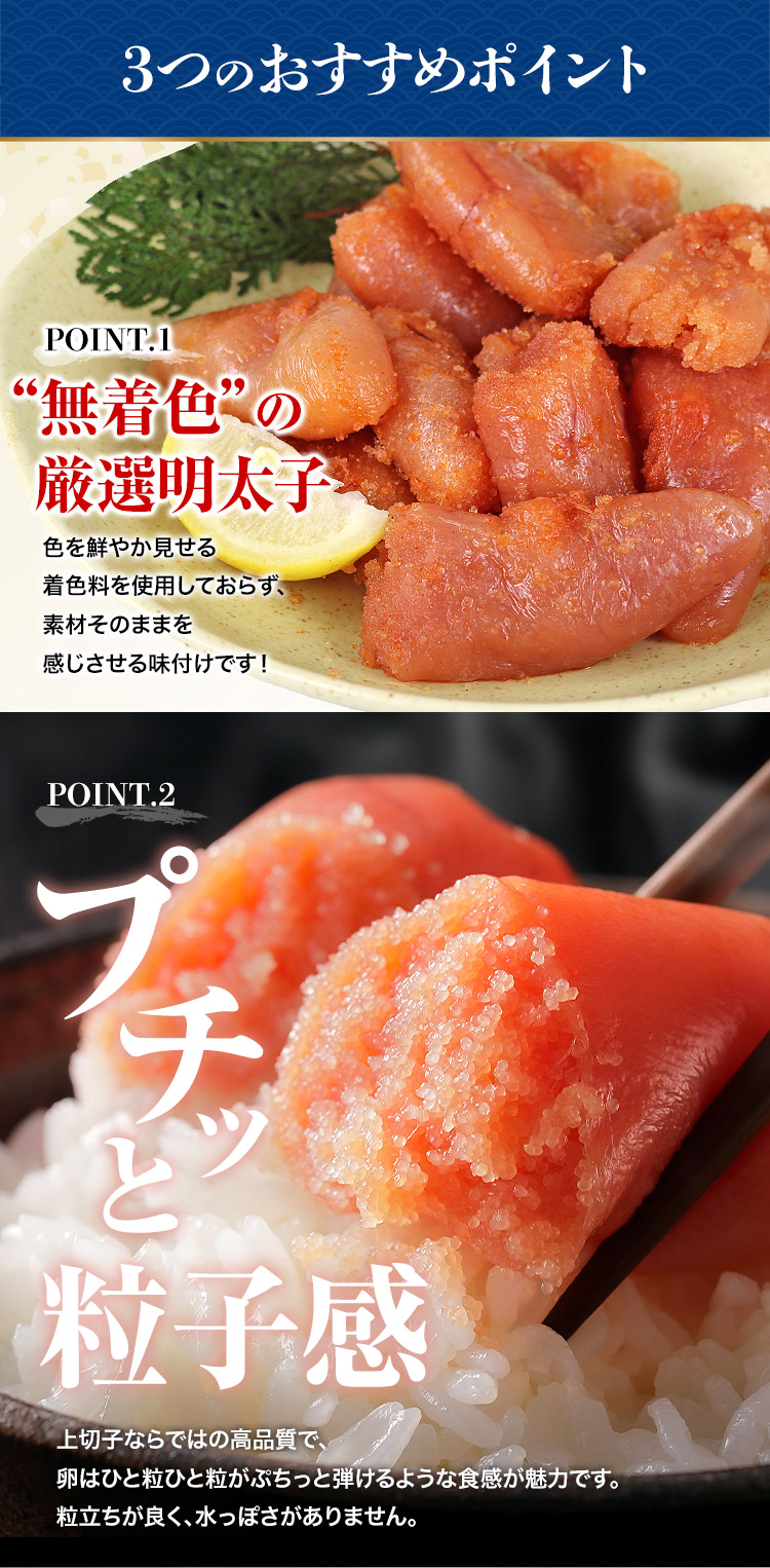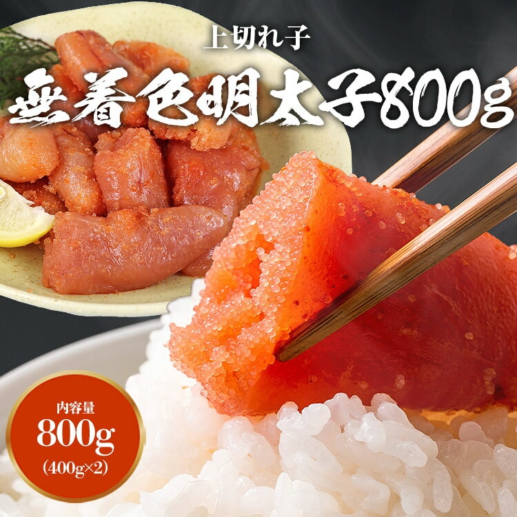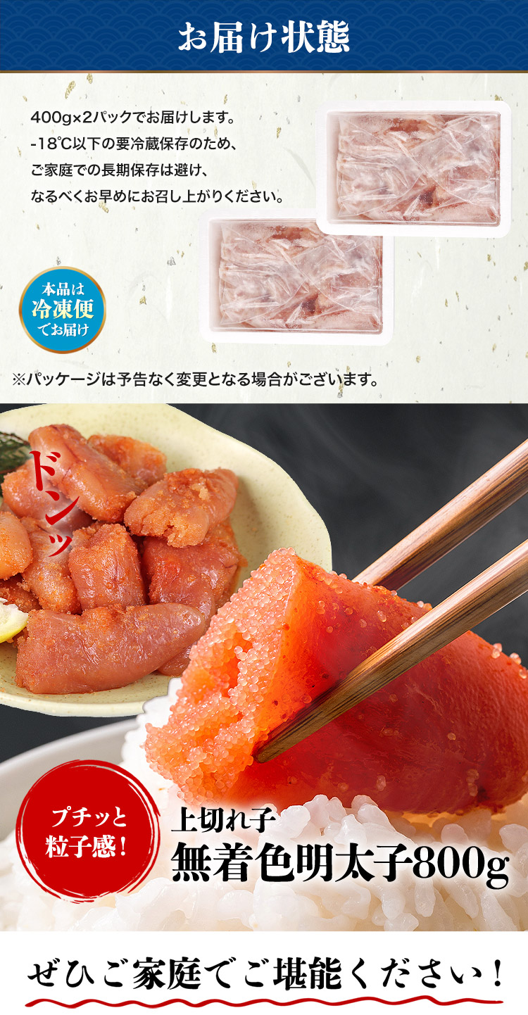 <商品詳細>【名称】辛子めんたいこ【原材料名】すけとうだらの卵巣(ロシア又は米国)、食塩、発酵調味料、果糖ブドウ糖液糖、魚介エキス、唐辛子、醤油(小麦・大豆を含む)/調味料(アミノ酸等)、酒精、甘味料(ソルビット)、酸化防止剤(V.C)、ナイアシン、pH調整剤、酵素、発色剤(亜硝酸Na)【内容量】400g×2【保存方法】要冷凍-18℃以下 【賞味期限】商品記載(※ご家庭の冷凍庫では1ヶ月程度を目安にお早めにお召し上がりください。)