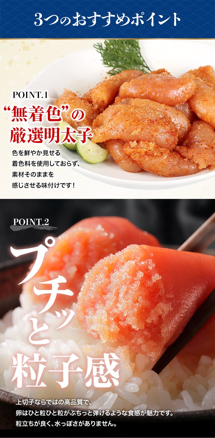 <商品詳細>【名称】辛子めんたいこ【原材料名】すけとうだらの卵巣(ロシア又は米国)、食塩、発酵調味料、果糖ブドウ糖液糖、魚介エキス、唐辛子、醤油(小麦・大豆を含む)/調味料(アミノ酸等)、酒精、甘味料(ソルビット)、酸化防止剤(V.C)、ナイアシン、pH調整剤、酵素、発色剤(亜硝酸Na)【内容量】400g×2【保存方法】要冷凍-18℃以下 【賞味期限】商品記載(※ご家庭の冷凍庫では1ヶ月程度を目安にお早めにお召し上がりください。)