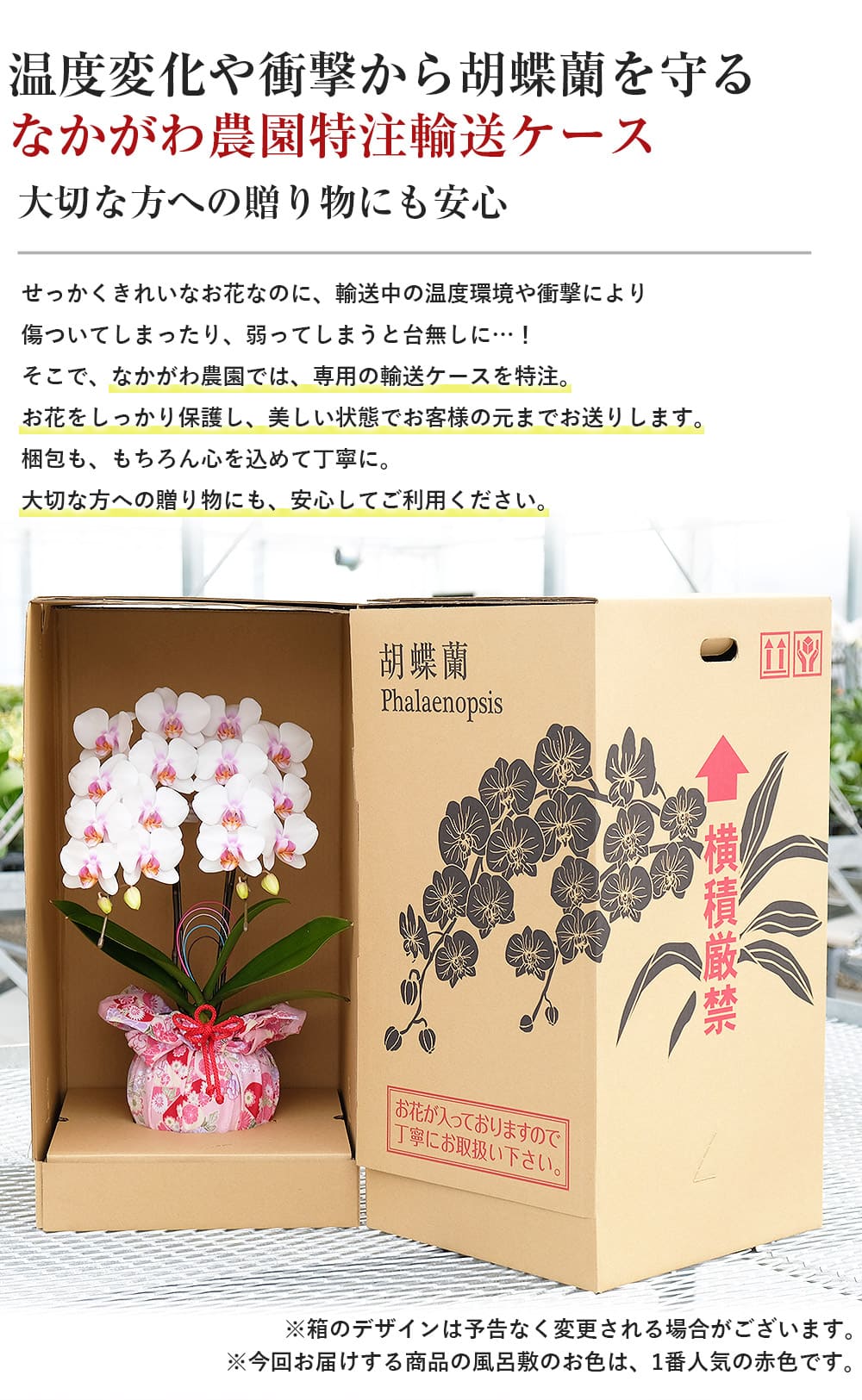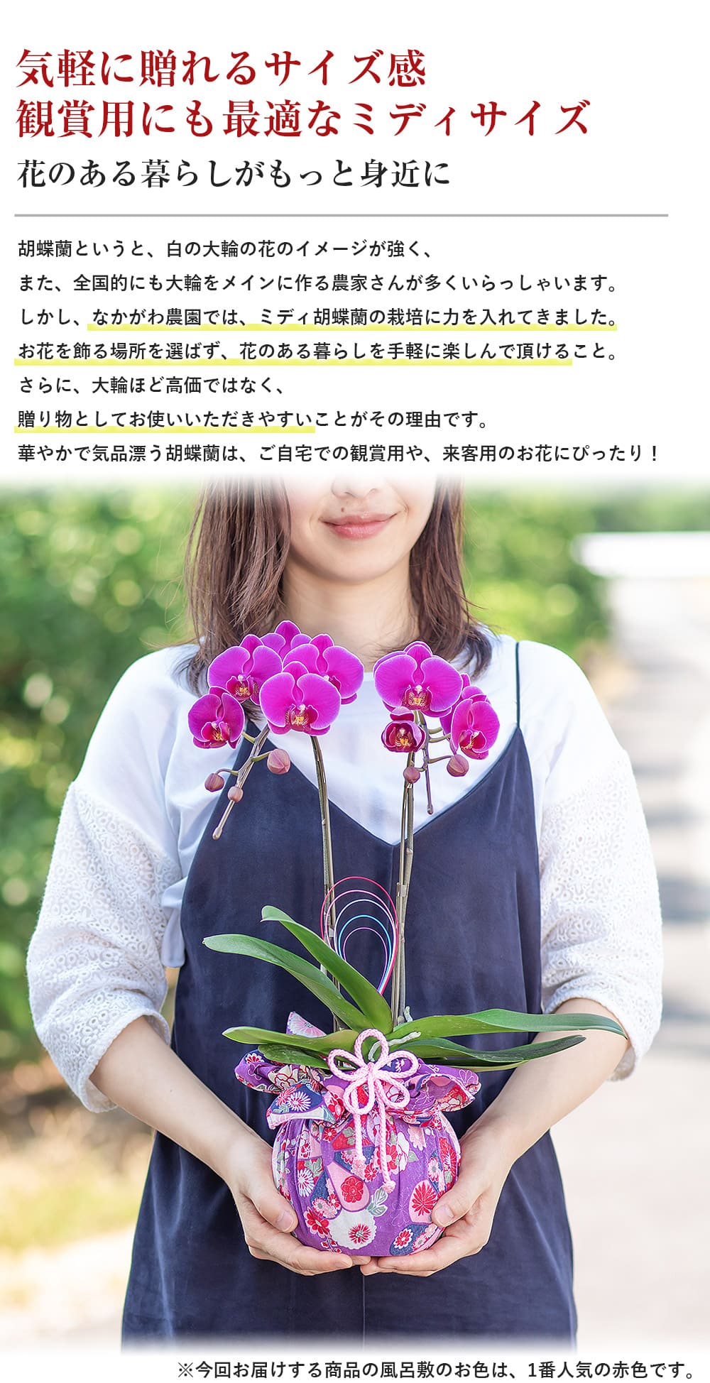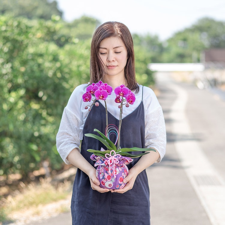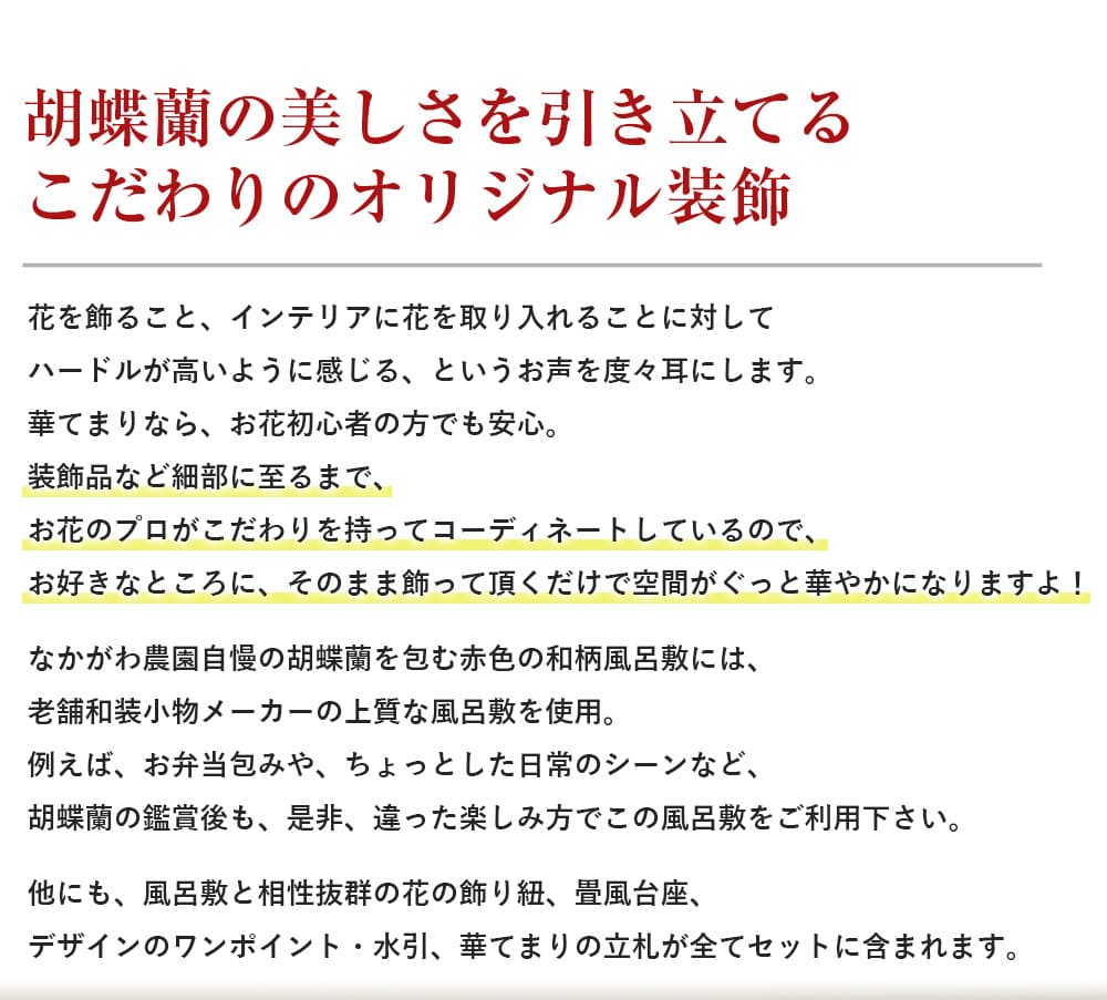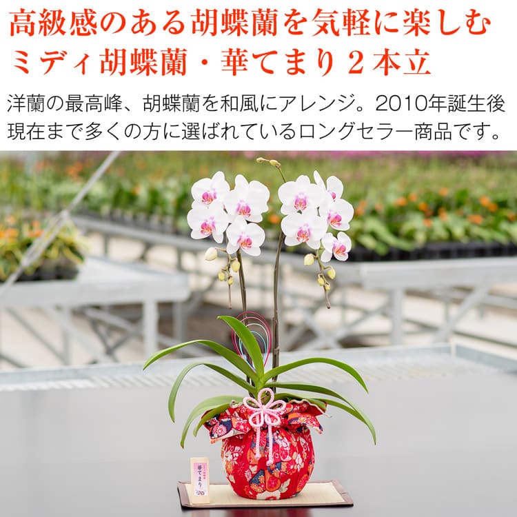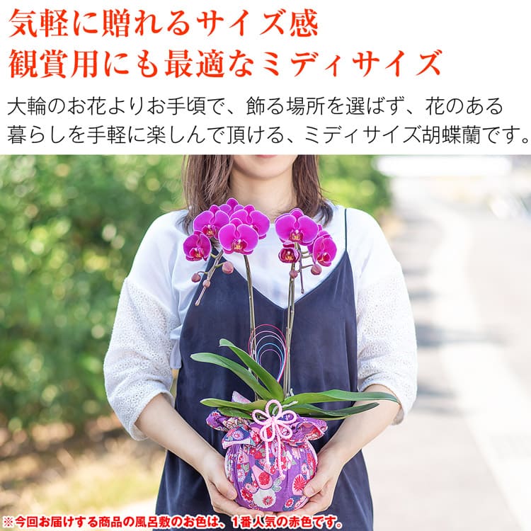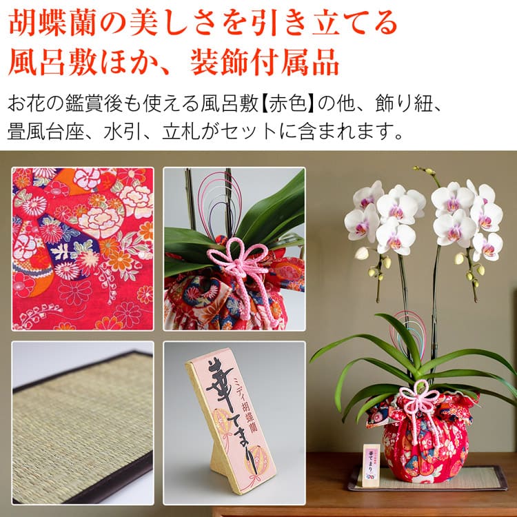 セット内容:ミディ胡蝶蘭、リーフレット、立札、台座、(風呂敷、飾り紐、水引)※()内は本体にセット済み