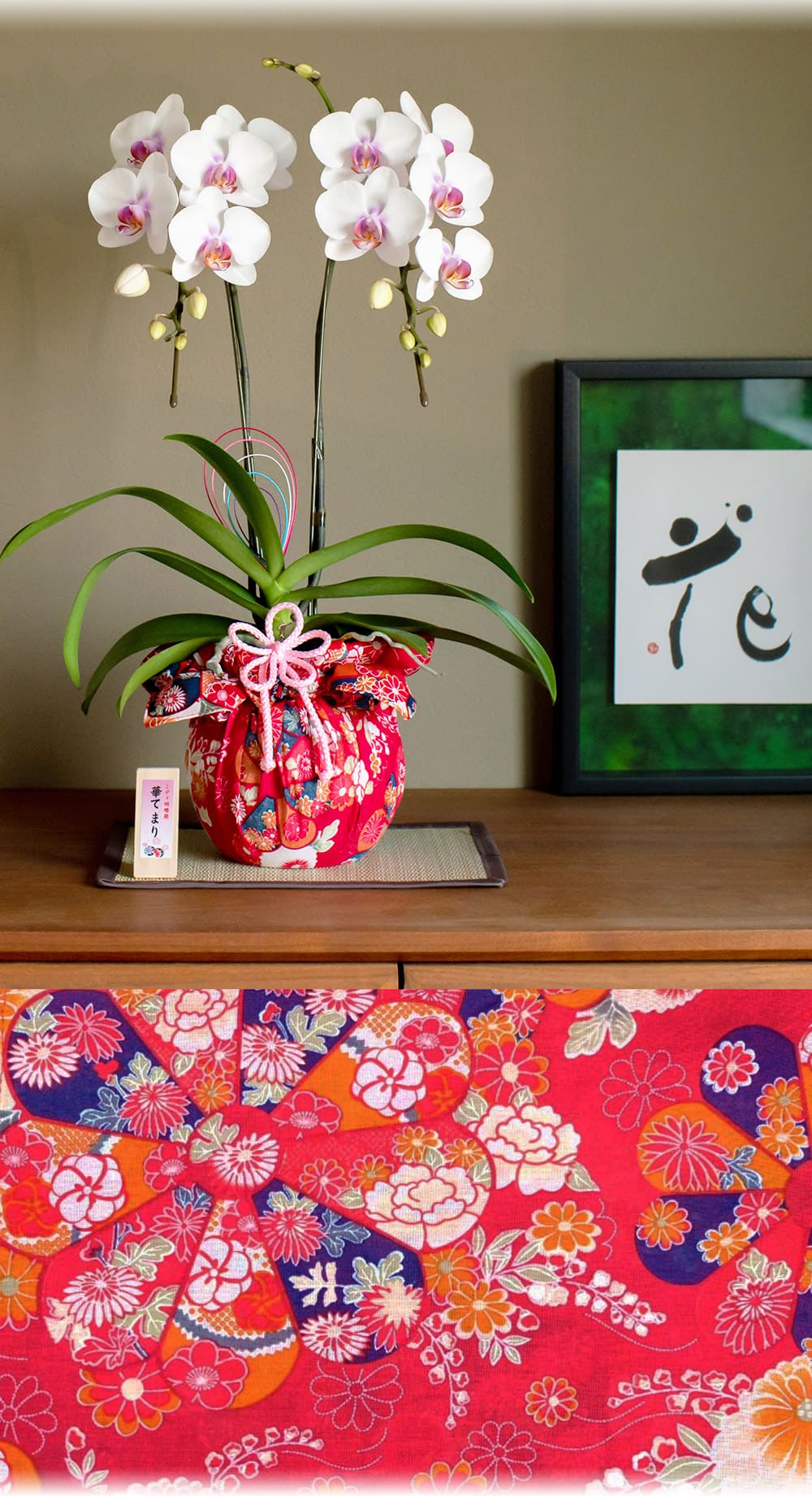 洋蘭の最高峰、胡蝶蘭(こちょうらん)を風呂敷や装飾品で和風にアレンジした華あかり。