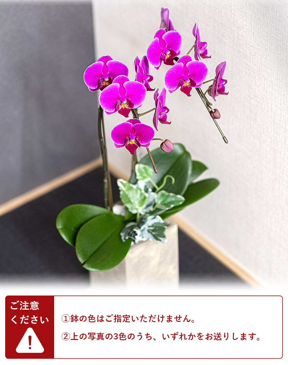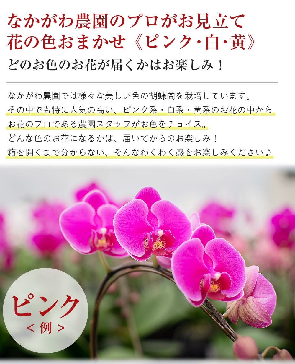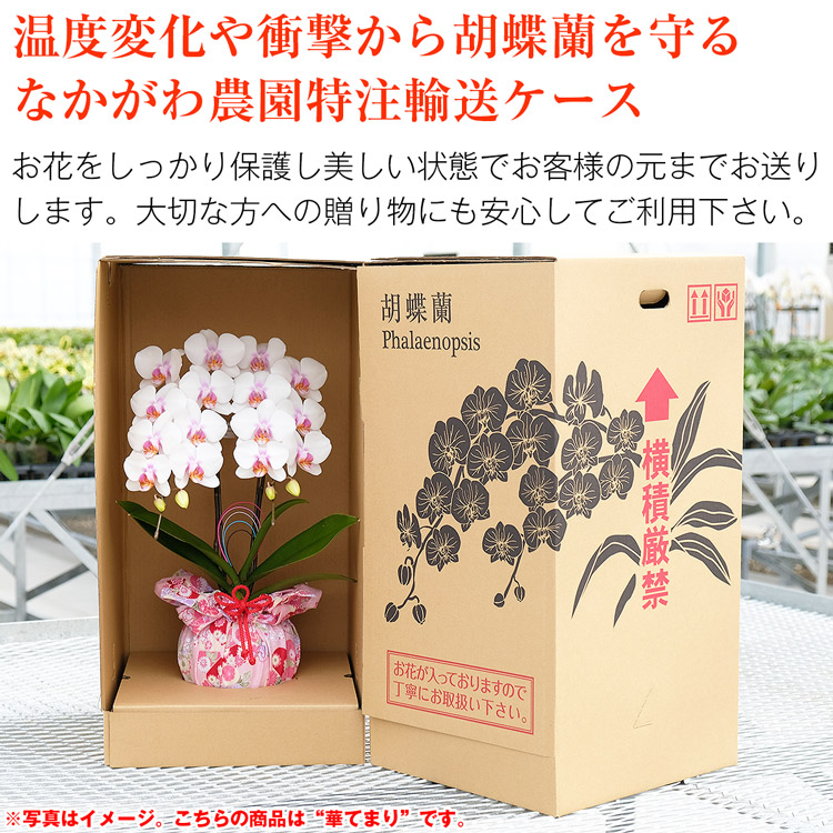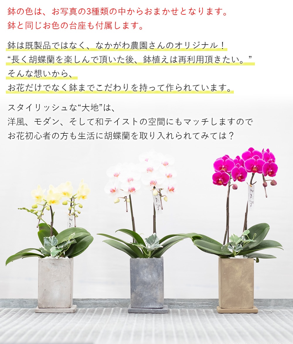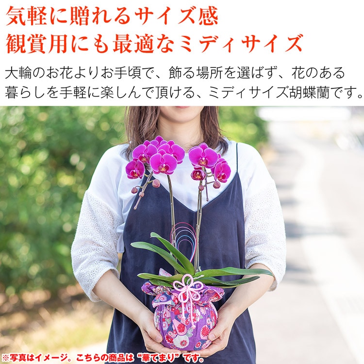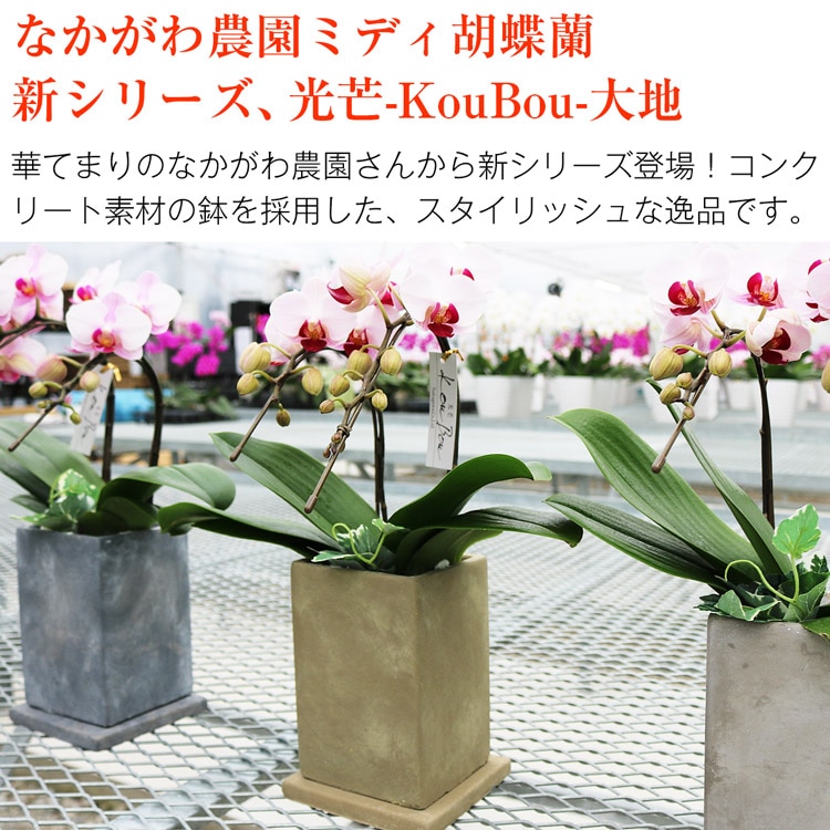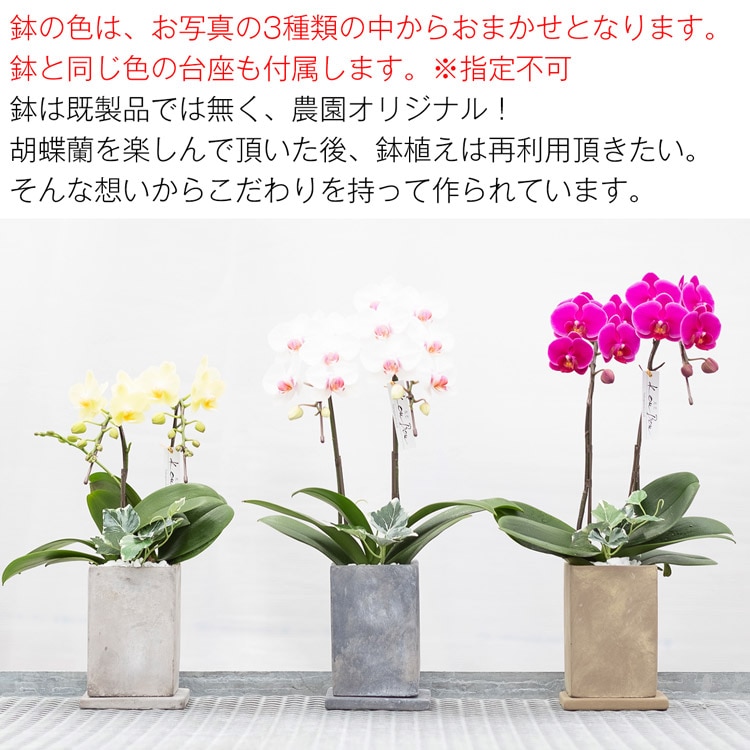 セット内容:ミディ胡蝶蘭、鉢、リーフレット※鉢と同色の台座が付属します。