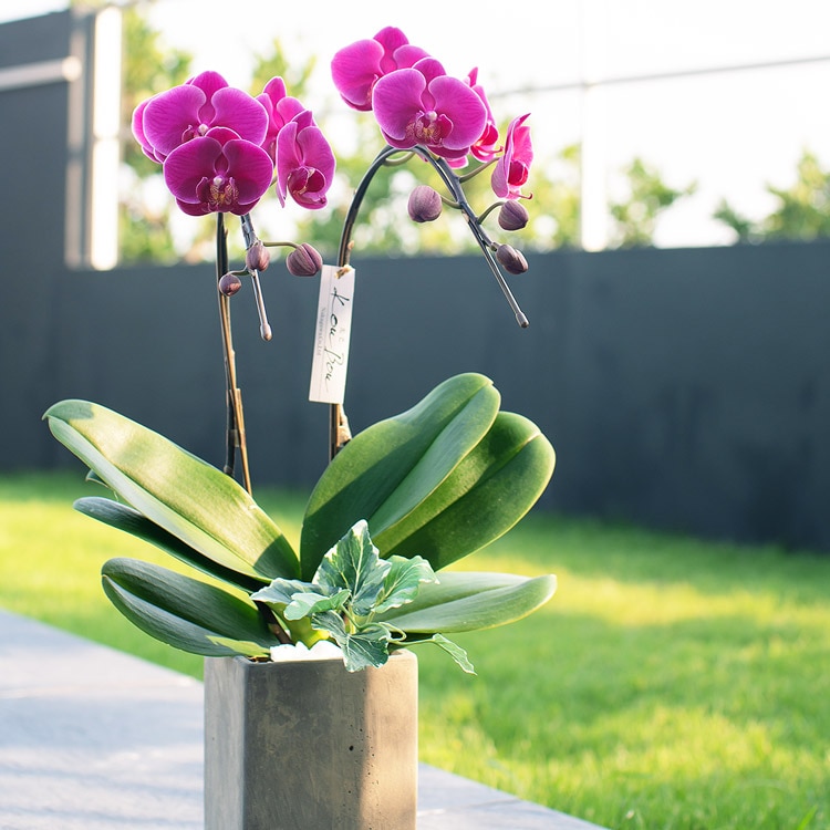 温かみのある胡蝶蘭の花と、無機質な印象のコンクリート素材。