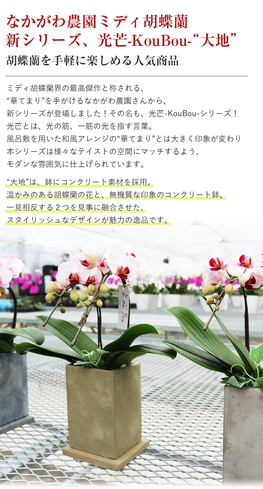 〇なかがわ農園ミディ胡蝶蘭新シリーズ、光芒-KouBou-“大地”