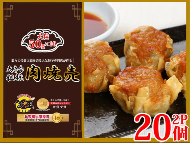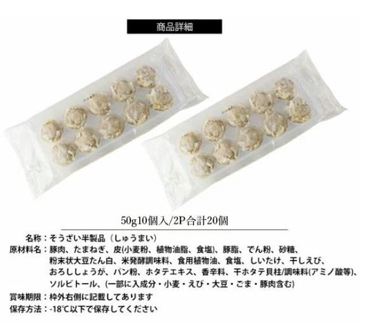 【原材料名】豚肉、たまねぎ、豚脂、でん粉、砂糖、粉末大豆たん白、醸造調味料、食用植物油、食塩、しいたけ、干しえび、おろししょうが、パン粉、ホタテエキス、香辛料、干ほたて貝柱、皮(小麦粉、植物油、食塩)/調味料(アミノ酸等)、ソルビトール、(一部にえび・小麦・乳製品・ごま・大豆・豚肉を含む)