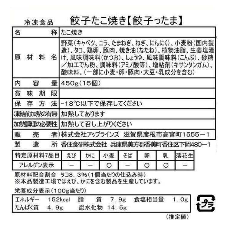 【原材料名】野菜(キャベツ、ニラ、たまねぎ、ねぎ、にんにく)、小麦粉(国内製造)、タコ、鶏卵、豚肉、焼き油(なたね)、植物油脂、生姜塩漬け、風味調味料(かつお)、しょうゆ、風味調味料(こんぶ)、砂糖/加工でん粉、調味料(アミノ酸等)、増粘剤(キサンタンガム)、酸味料、(一部に小麦・卵・豚肉・大豆・乳成分を含む)