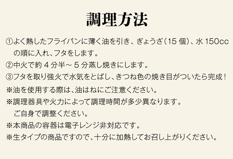 【原材料名】皮(小麦粉(国内製造)、ラード、中華調味料、食塩、スイートコーンパウダー)、豚肉、キャベツ、たまねぎ、パン粉、ラード、中華調味料、にら、ごま油、でん粉、マーガリン、おろしにんにく、ねぎ、食塩、こしょう/ソルビトール、調味料(アミノ酸等)、(一部にかに・小麦・乳製分・牛肉・ごま・大豆・鶏肉・豚肉・ゼラチンを含む)